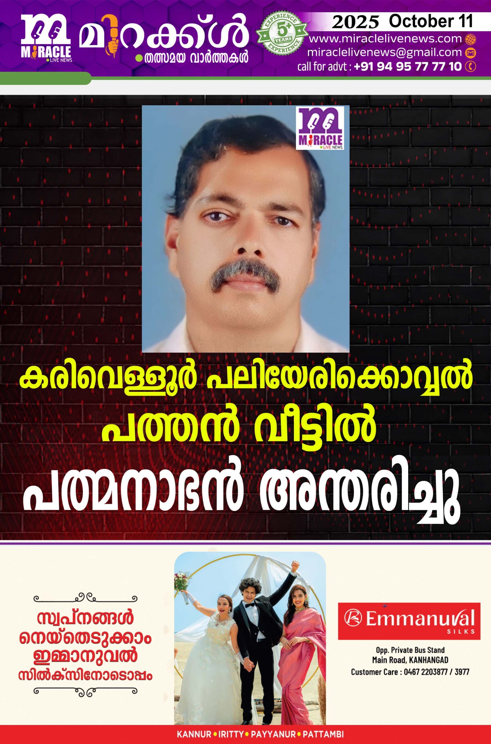 കരിവെള്ളൂര്‍’ പലിയേരിക്കൊവ്വല്‍ പത്തന്‍ വീട്ടില്‍ പത്മനാഭന്‍ (62)അന്തരിച്ചു. ഭാര്യ : പ്രീത കെ. ടി. (കരിവെള്ളൂര്‍ സര്‍വീസ് സഹ:ബാങ്ക്). മകന്‍ : ശ്രീരാഗ് പത്മനാഭന്‍ (വിദ്യാര്‍ത്ഥി), മാതാവ്: പത്തന്‍ വീട്ടില്‍ മീനാക്ഷി. പിതാവ് : പരേതനായ കരിമ്പില്‍ കുമാരന്‍.