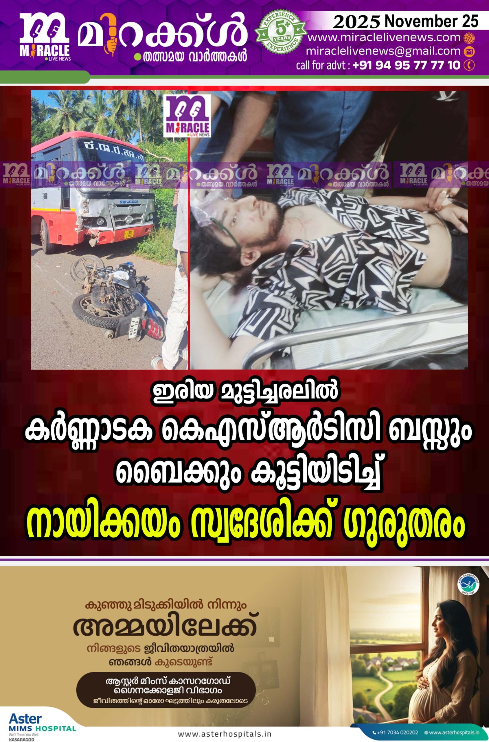 ഇരിയ മുട്ടിച്ചരലില്‍ കര്‍ണ്ണാടക കെഎസ്ആര്‍ടിസി ബസ്സും ബൈക്കും കൂട്ടിയിടിച്ച് നായിക്കയം സ്വദേശിക്ക് ഗുരുതരം