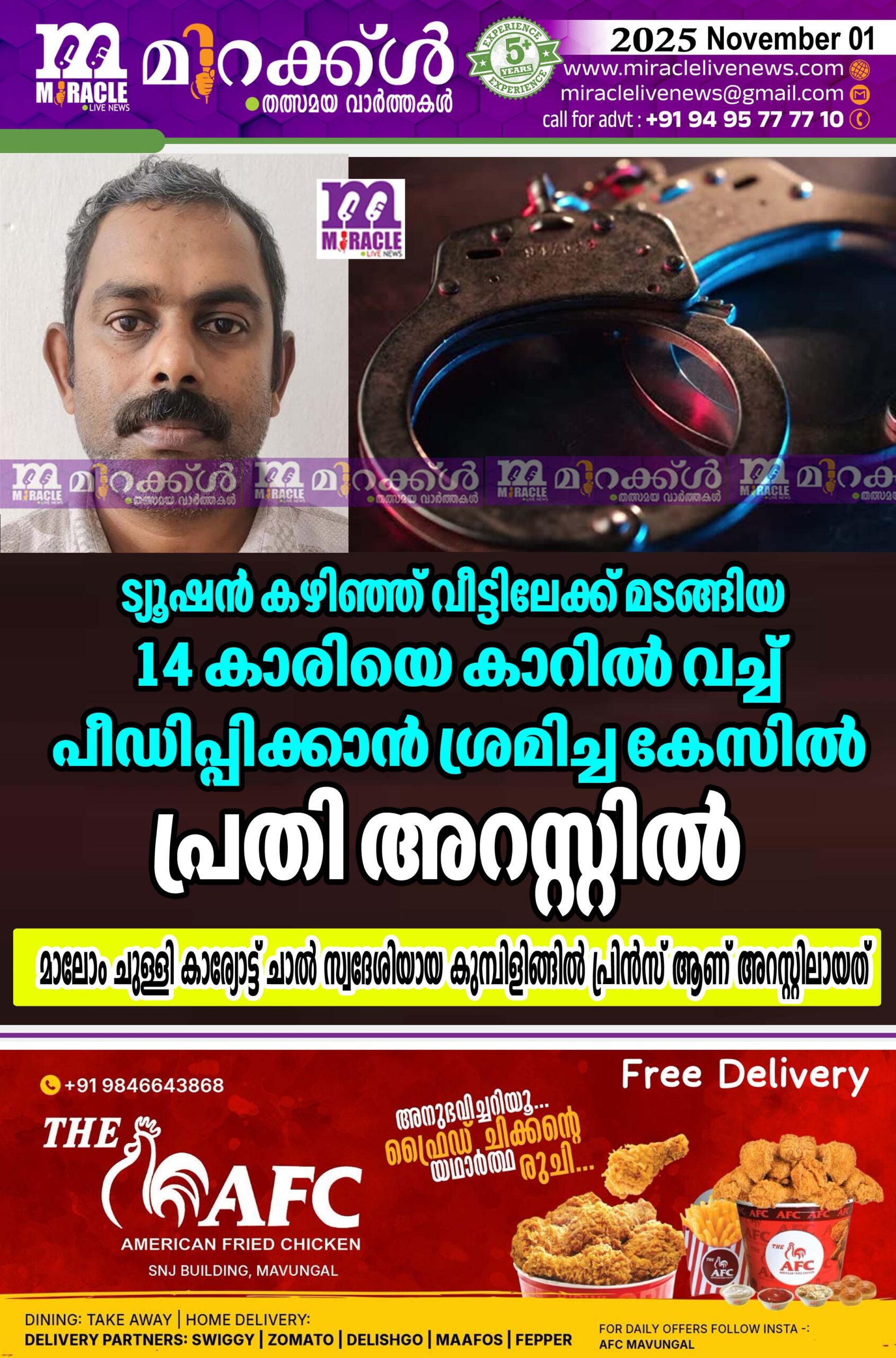 ട്യൂഷന്‍ കഴിഞ്ഞ് വീട്ടിലേക്ക് മടങ്ങിയ 14 കാരിയെ കാറില്‍ വച്ച് പീഡിപ്പിക്കാന്‍ ശ്രമിച്ച കേസില്‍ പ്രതി അറസ്റ്റില്‍; മാലോം ചുള്ളി കാര്യോട്ട് ചാല്‍ സ്വദേശിയായ കുമ്പിളിങ്ങില്‍ പ്രിന്‍സ് ആണ് അറസ്റ്റിലായത്