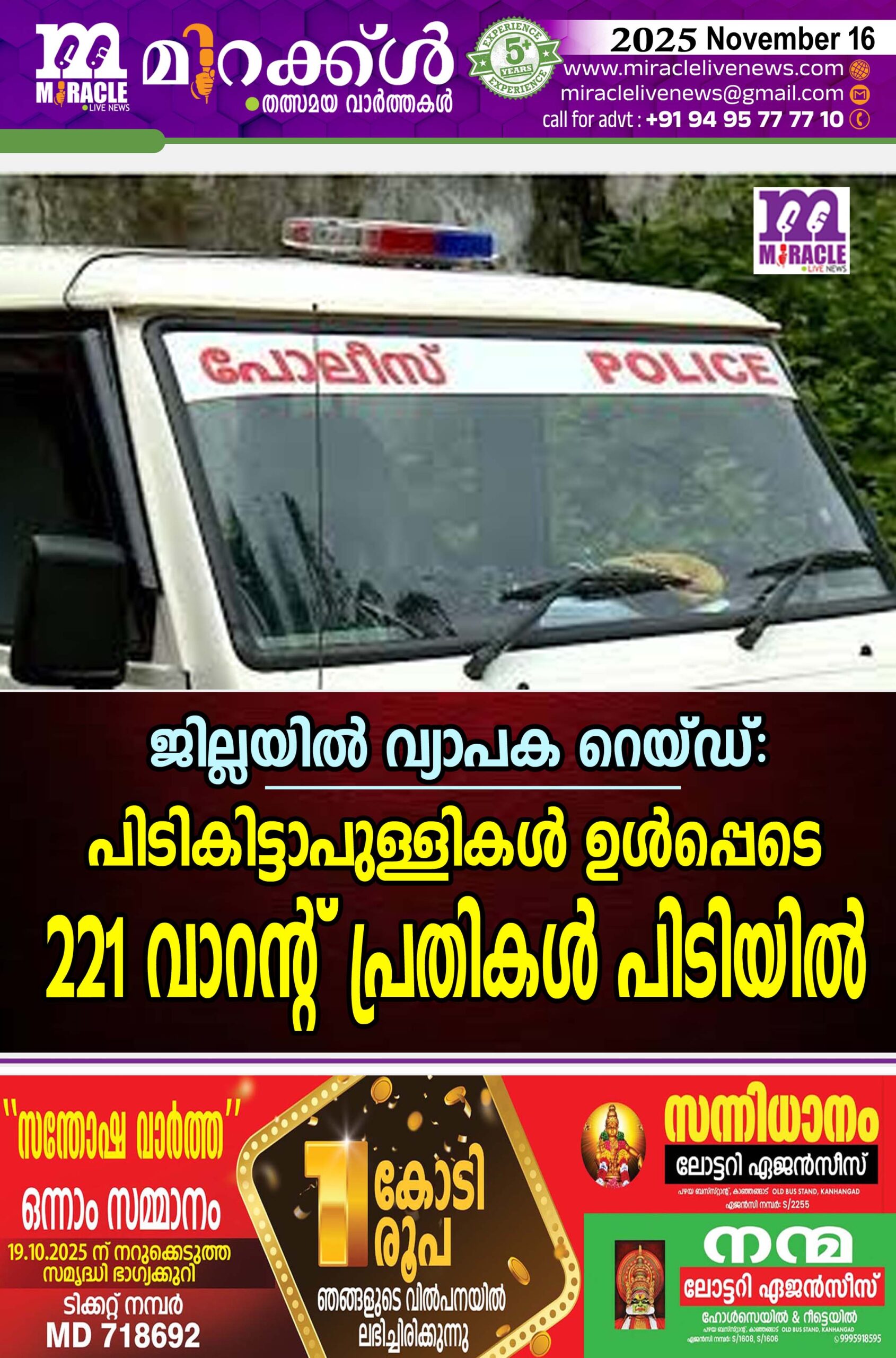 ജില്ലയില്‍ വ്യാപക റെയ്ഡ്: പിടികിട്ടാപുള്ളികള്‍ ഉള്‍പ്പെടെ 221 വാറന്റ് പ്രതികള്‍ പിടിയില്‍