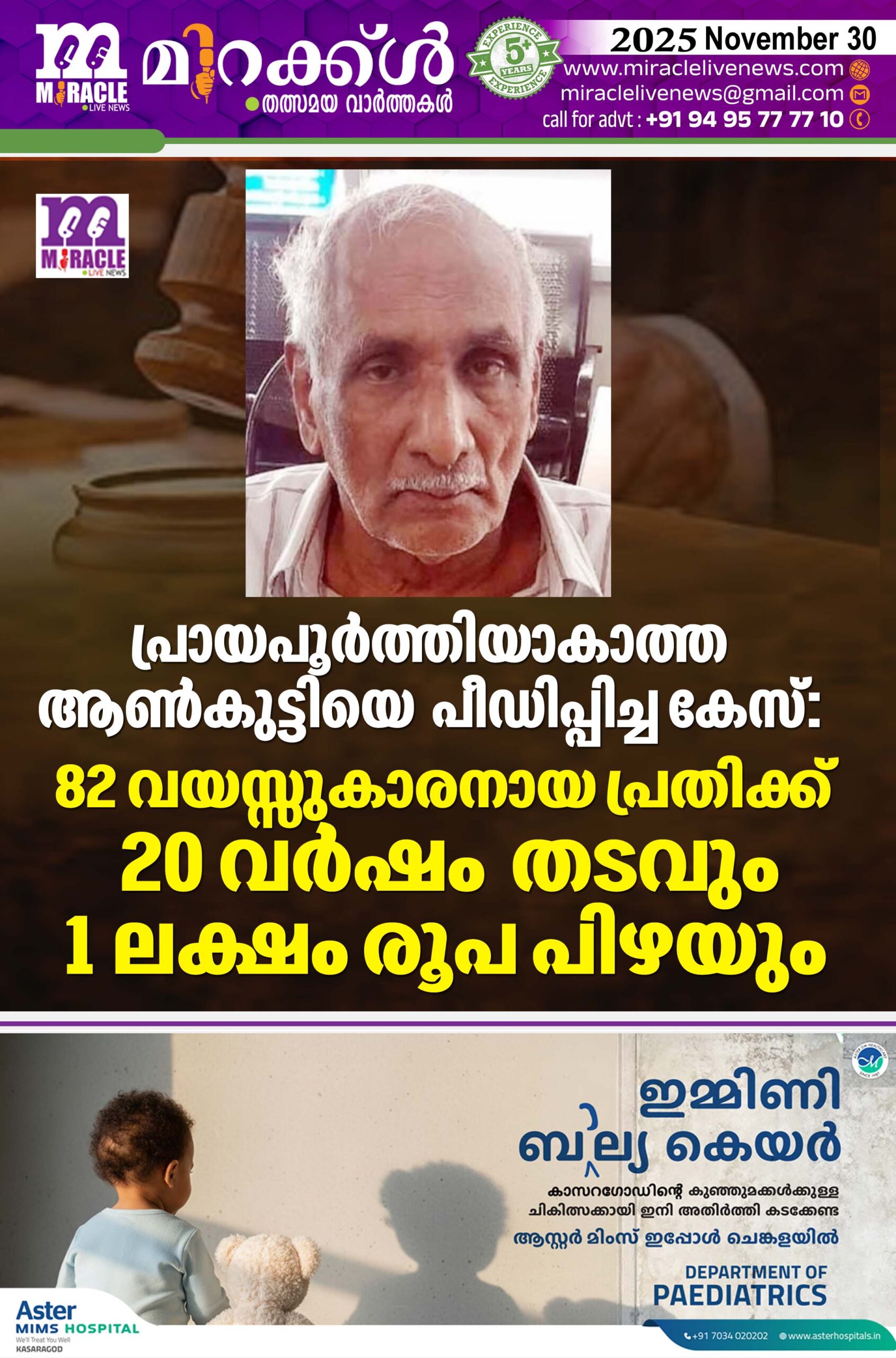 കാഞ്ഞങ്ങാട് : പ്രായപൂര്ത്തിയാകാത്ത ആണ്കുട്ടിയെ ലൈംഗികമായി പീഡിപ്പിച്ച കേസിലെ 82 വയസ്സുകാരനായ പ്രതിക്ക് 20 വര്ഷം സാധാരണ തടവും 1 ലക്ഷം രൂപ പിഴയും, പിഴയും. അടച്ചില്ലെങ്കില് 2 വര്ഷം അധിക തടവിനും ശിക്ഷ വിധിച്ചു. മേല്പറമ്പ പോലീസ് സ്റ്റേഷന് പരിധിയില് താമസിക്കുന്ന 14 വയസ് പ്രായമുള്ള ആണ്കുട്ടിയെ പ്രതിയായ ചെമ്മനാട് കടവത്ത് റോഡ് നിഷ മനസില്,