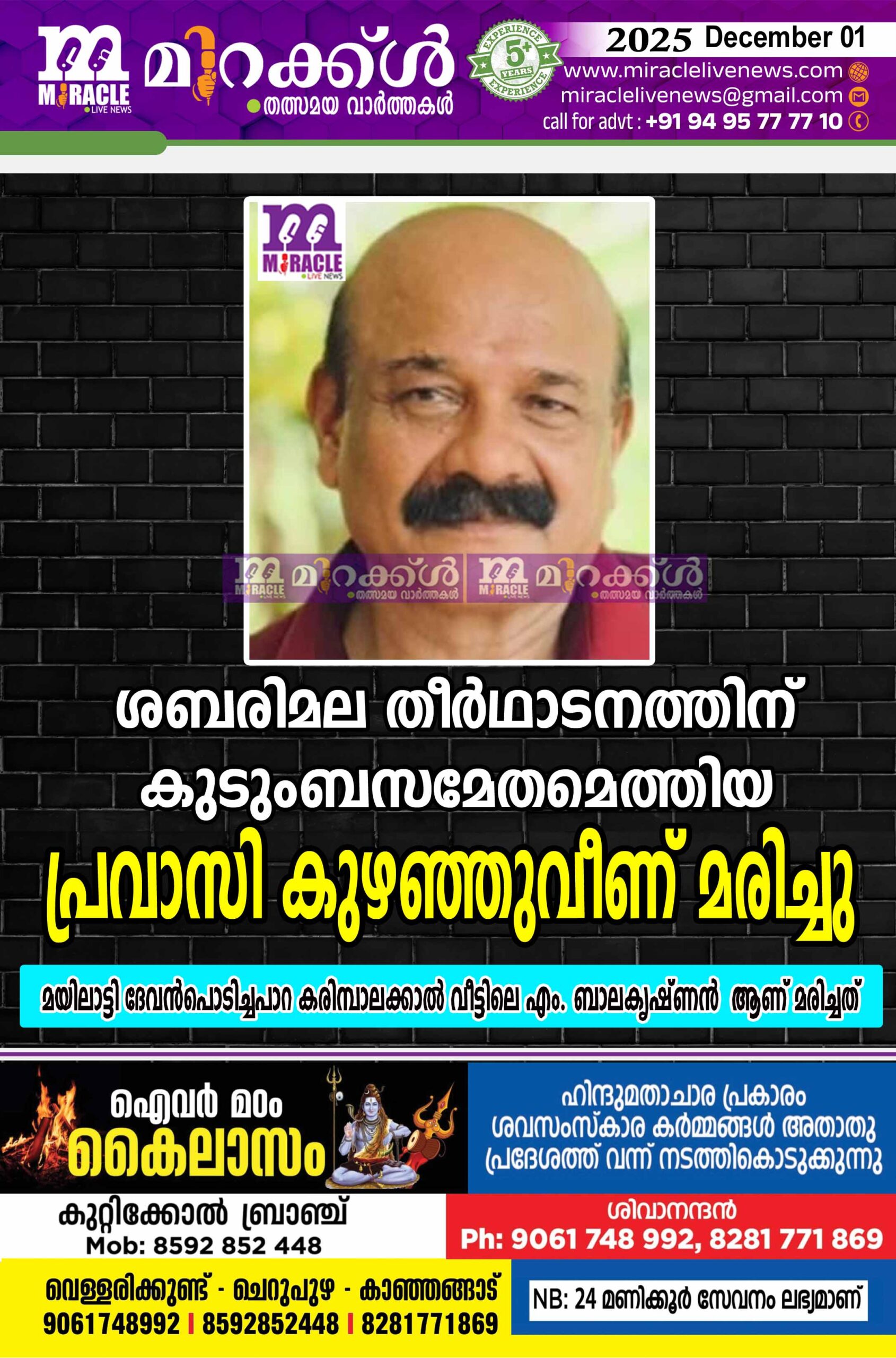 ശബരിമല തീര്‍ഥാടനത്തിന് കുടുംബസമേതമെത്തിയ പ്രവാസി കുഴഞ്ഞുവീണ് മരിച്ചു; മയിലാട്ടി ദേവന്‍പൊടിച്ചപാറ കരിമ്പാലക്കാല്‍ വീട്ടിലെ എം. ബാലകൃ ഷ്ണന്‍ ആണ് മരിച്ചത്