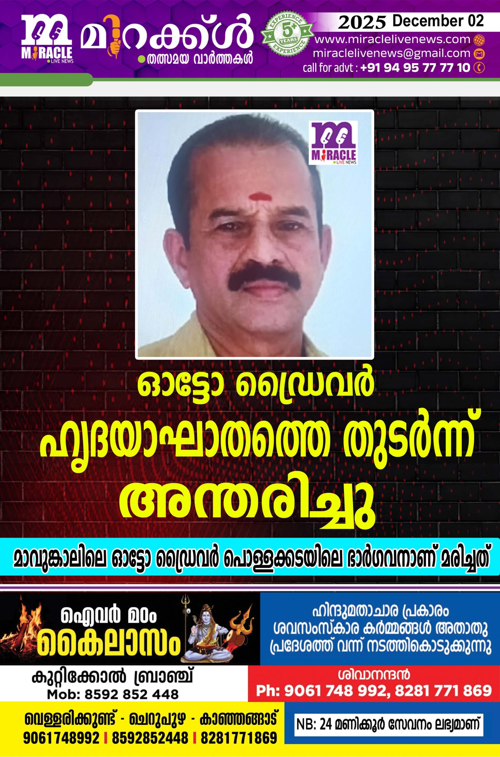 ഓട്ടോ ഡ്രൈവര് ഹൃദയാഘാതത്തെ തുടര്ന്ന് അന്തരിച്ചു; മാവുങ്കാലിലെ ഓട്ടോ ഡ്രൈവര് പൊള്ളക്കടയിലെ ഭാര്ഗവനാണ് മരിച്ചത്