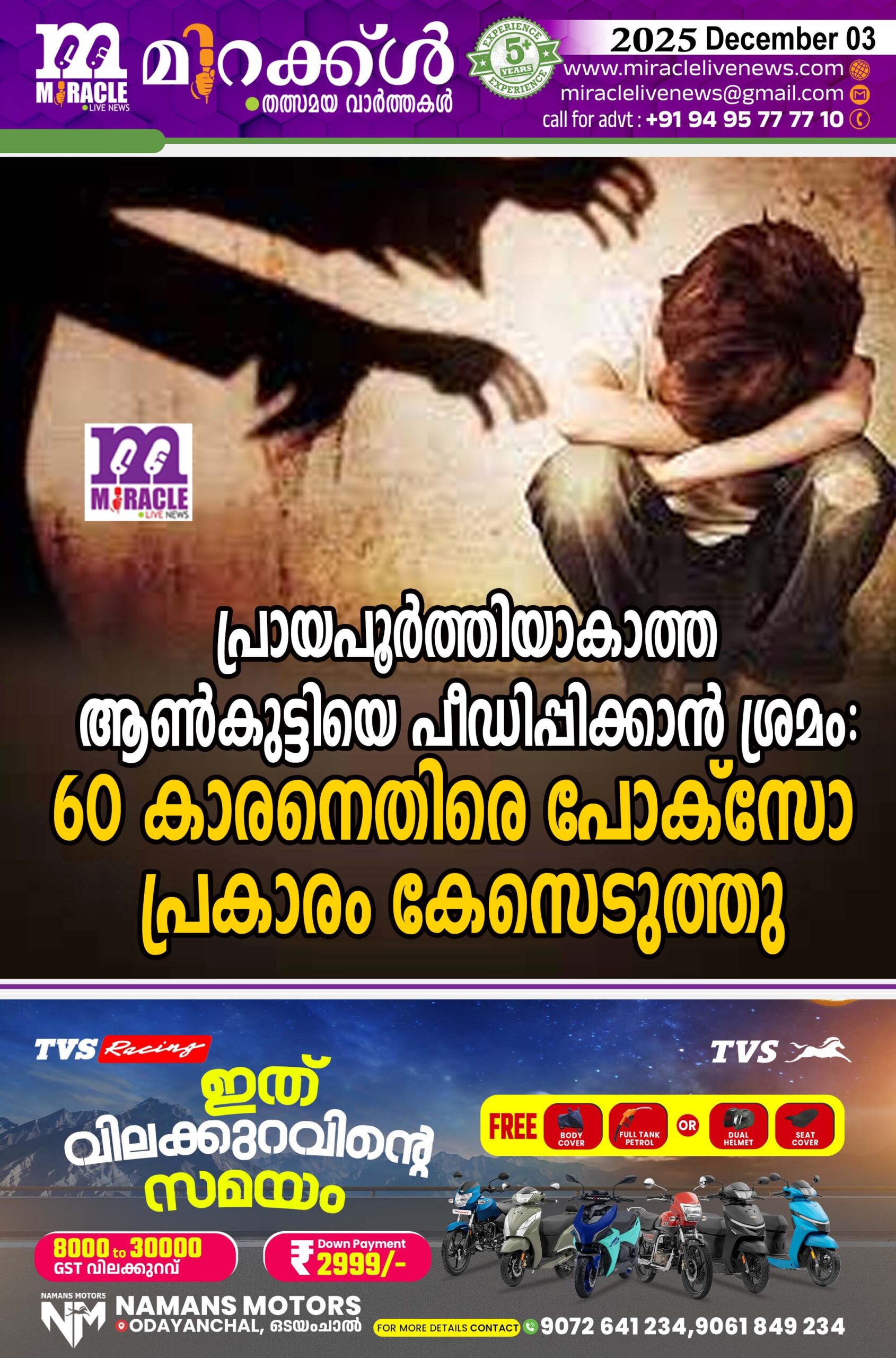 പരപ്പ :പ്രായപൂര്ത്തിയാകാത്ത ആണ്കുട്ടിയെ പീഡിപ്പിക്കാന് ശ്രമം. 60 കാരനെതിരെ വെള്ളരിക്കുണ്ട് പോലീസ് പോക്സോ പ്രകാരം കേസെടുത്തു. ക്ലായിക്കോട് സ്വദേശി അബ്ദുല് റസാക്ക് (60) നെതിരെയാണ് പോലീസ് കേസ് രജിസ്റ്റര് ചെയ്തത്. മദ്രസയിലേക്ക് പോകുന്ന വഴിയില് എട്ടാം ക്ലാസ് വിദ്യാര്ത്ഥിയെ മിഠായി തരാം എന്നു പറഞ്ഞു കാറില് കയറ്റി പീഡിപ്പിക്കാന് ശ്രമിക്കുകയായിരുന്നു. കുട്ടി മദ്രസ അധ്യാപകനോട് കാര്യം പറയുകയും അദ്ദേഹം ചൈല്ഡ് ലൈനില് വിവരം അറിയിക്കുകയും ആയിരുന്നു. കുട്ടിയുടെ മാതാവിന്റെ പരാതിയില് പോലീസ് പ്രായപൂര്ത്തിയാകാത്ത കുട്ടികളെ ഉപദ്രവിക്കല് പോക്സോ പ്രകാരം കേസെടുത്ത് അന്വേഷണം ആരംഭിച്ചു.