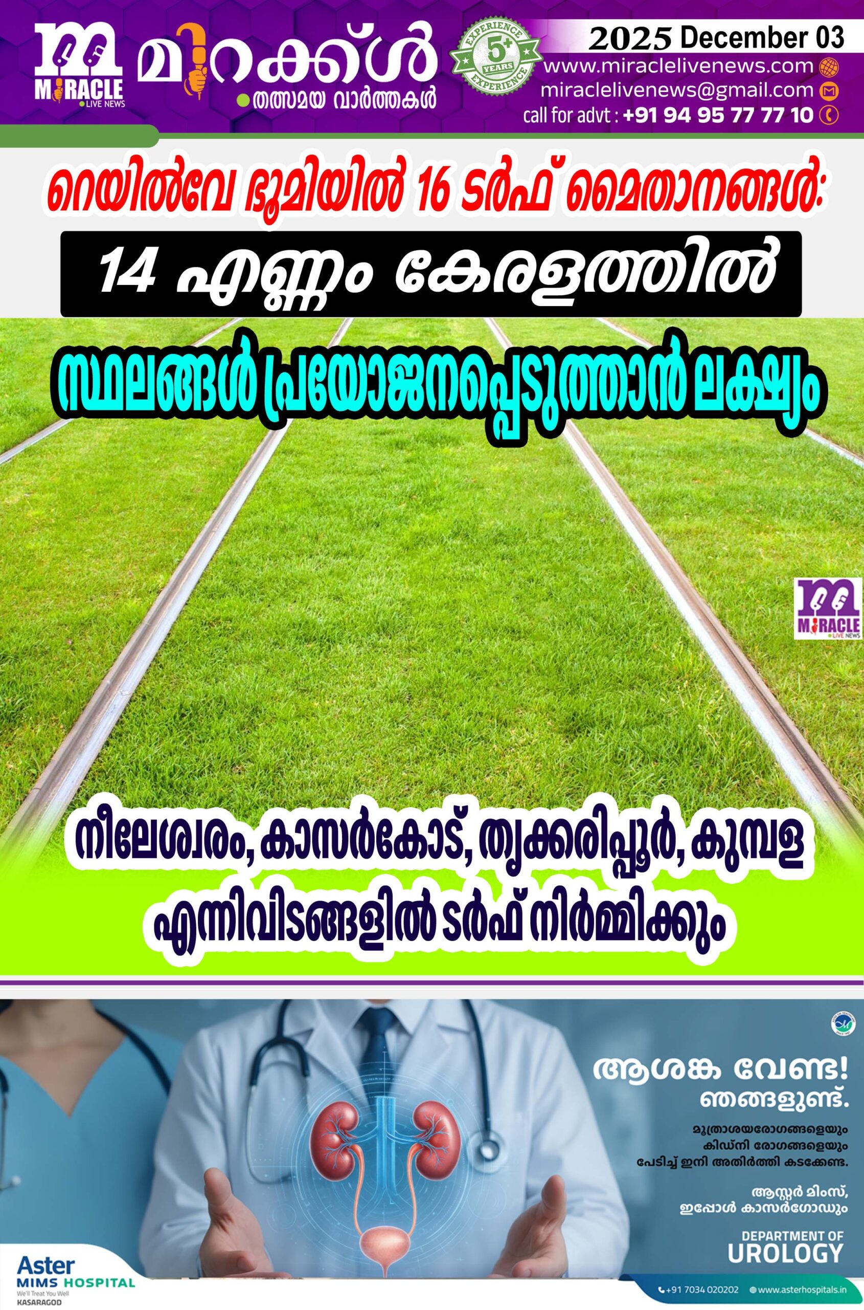 കാഞ്ഞങ്ങാട്: രാജ്യത്ത് റെയില്വേയുടെ ഉടമസ്ഥതയിലുള്ളതും ഉപയോഗശൂന്യവുമായി കിടക്കുന്ന ഭൂമി ഫലപ്രദമായി പ്രയോജനപ്പെടുത്തുന്നതിന്റെ ഭാഗമായി 16 പുതിയ ടര്ഫ് മൈതാനങ്ങള് നിര്മ്മിക്കാന് റെയില്വേ തീരുമാനിച്ചു. കേരളം, തമിഴ്നാട്, കര്ണാടകം എന്നീ സംസ്ഥാനങ്ങളിലായാണ് ഈ ടര്ഫ് കോര്ട്ടുകള് സ്ഥാപിക്കുക. റെയില്വേയുടെ ഉടമസ്ഥതയിലുള്ള ഒട്ടേറെ സ്ഥലങ്ങള് വെറുതെ കിടക്കുന്ന സാഹചര്യത്തില്, അവയെ പൊതുജനങ്ങള്ക്ക് ഉപയോഗപ്രദമായ കായിക സൗകര്യങ്ങളാക്കി മാറ്റുക എന്ന ബഹുമുഖ ലക്ഷ്യത്തോടെയാണ് ഈ പദ്ധതിക്ക് റെയില്വേ ബോര്ഡ് രൂപം നല്കിയിരിക്കുന്നത്.