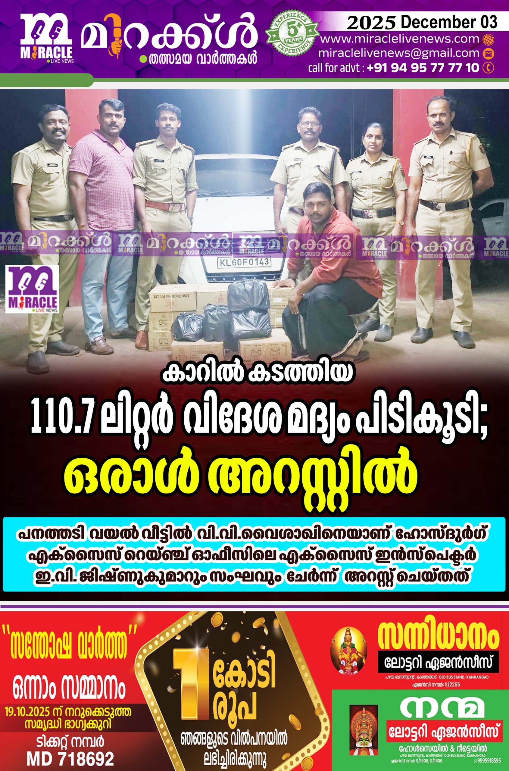 കാഞ്ഞങ്ങാട്: കാറില് കടത്തിയ 110.7 ലിറ്റര് വിദേശ മദ്യം പിടികൂടി. ഒരാള് അറസ്റ്റില്. പനത്തടി വയല് വീട്ടില് വി.വി.വൈശാഖ് (27) നെയാണ് ഹോസ്ദുര്ഗ് എക്സൈസ് റെയ്ഞ്ച് ഓഫീസിലെ എക്സൈസ് ഇന്സ്പെക്ടര് ഇ.വി. ജിഷ്ണുകുമാറും സംഘവും ചേര്ന്ന്