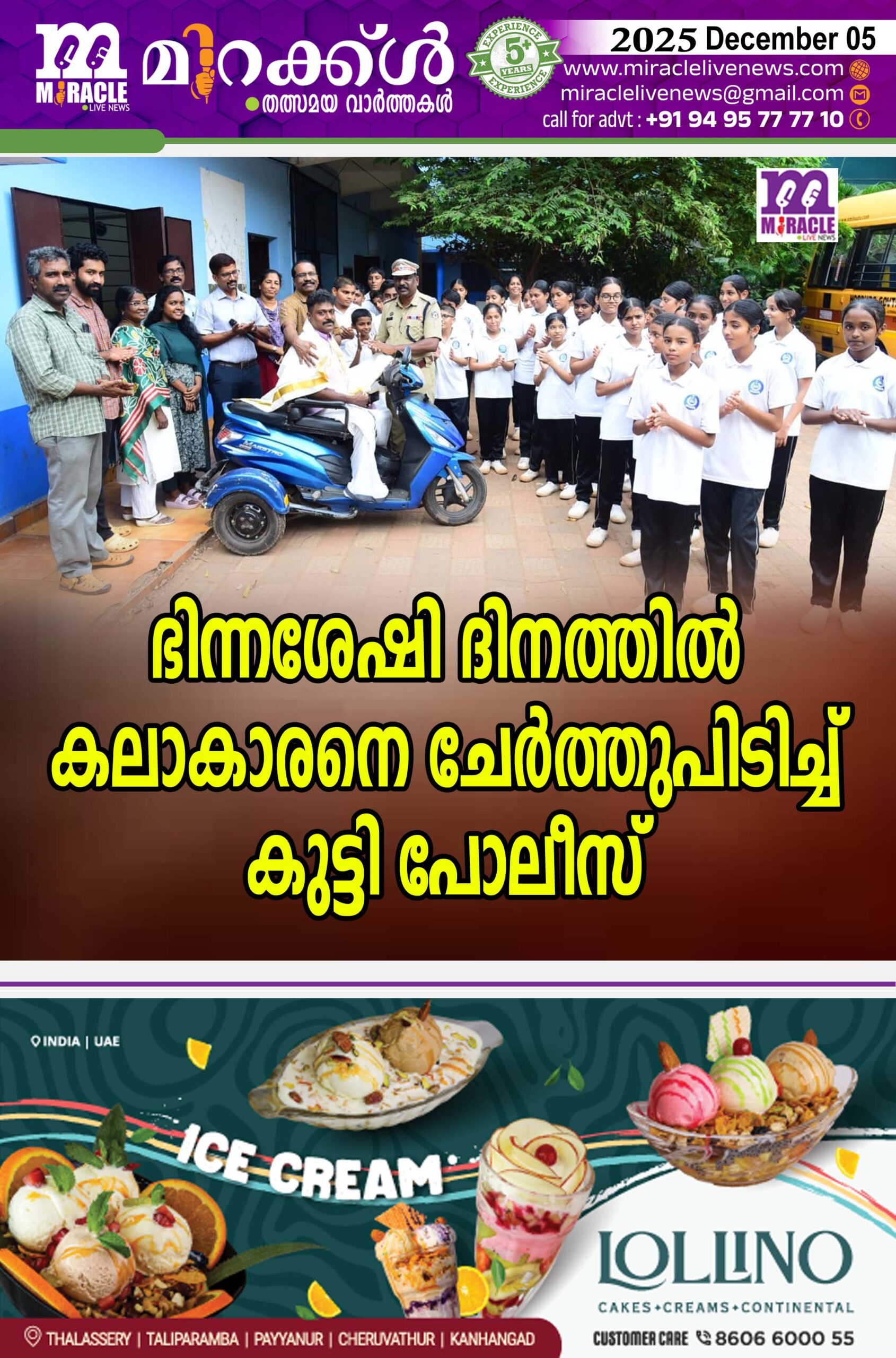കാഞ്ഞങ്ങാട് : കലയുടെ അതിരുകള് ഭേദിച്ച്, ഭിന്നശേഷിക്കിടയിലും ശ്രദ്ധേയമായ പ്രകടനം കാഴ്ചവെച്ച കലാകാരന് സുധി ചെമ്മട്ടംവയലിനെ ജി എച്ച് എസ് എസ് ഹോസ്ദുര്ഗ് സ്റ്റുഡന്റ്സ് പോലീസ് കേഡറ്റ് (എസ് പി സി) യൂണിറ്റിന്റെയും ജനമൈത്രി പോലീസ് ഹോസ്ദുര്ഗിന്റെയും ആഭിമുഖ്യത്തില് സ്കൂളില് വെച്ച് ആദരിച്ചത്. ഹെഡ്മാസ്റ്റര് എം പി രാജേഷ് പൊന്നാട അണിയിച്ച് ആദരിച്ചു.