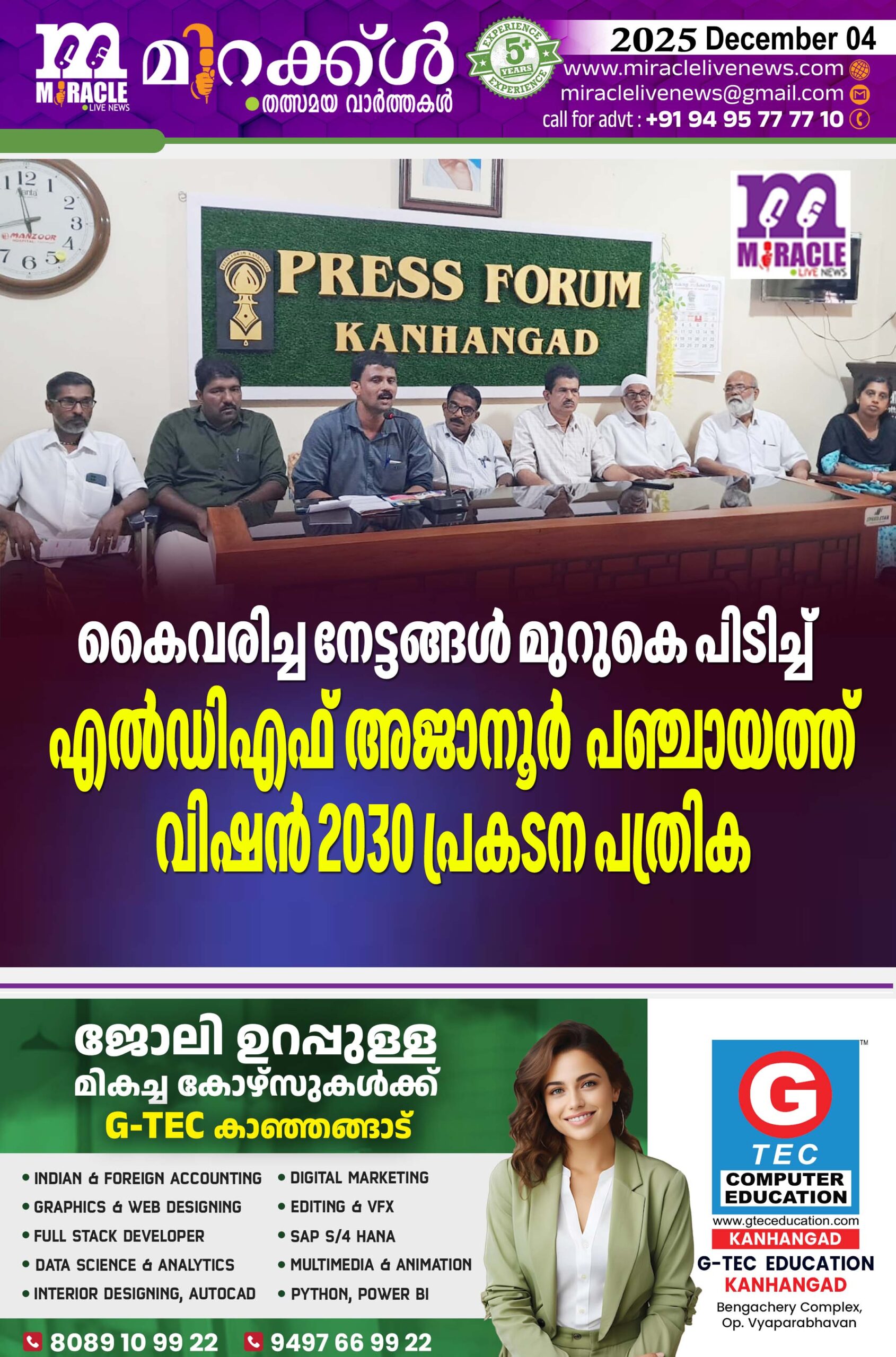 കാഞ്ഞങ്ങാട് : കൈവരിച്ച നേട്ടങ്ങള്‍ മുറുകെ പിടിച്ച് പുതിയ കാലത്തെ വരവേല്‍ക്കാനായി എല്‍ഡിഎഫ് അജാനൂര്‍ പഞ്ചായത്ത് വിഷന്‍2030 പ്രകടന പത്രിക സംസ്ഥാന സര്‍ക്കാറിന്‌ഹെറ ജനക്ഷേമ പദ്ധതികള്‍ക്കുപുറമെ തനത് പദ്ധതികള്‍ ആവിഷ്‌കരിച്ചു. 213 കോടി രുപയുടെ വികസനപ്രവൃത്തികളാണ് പഞ്ചായത്തില്‍ നടപ്പാക്കിയതെന്ന് എല്‍ഡിഎഫ് നേതാക്കള്‍ വാര്‍ത്താ സമ്മേളനത്തില്‍ അറിയിച്ചു.