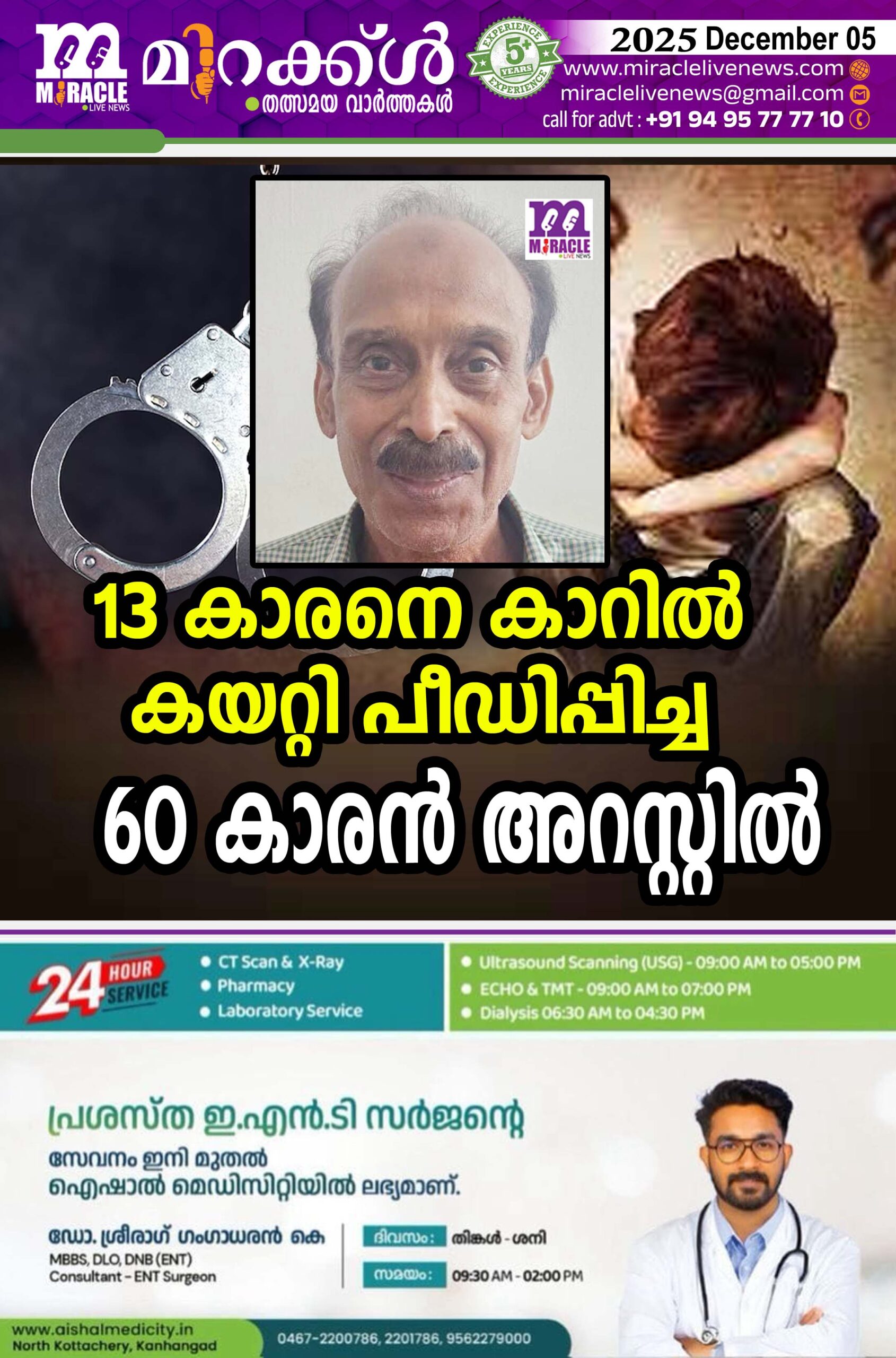 പരപ്പ: 13 കാരനായ മദ്രസ വിദ്യാര്ത്ഥിയെ കാറില് കയറ്റിക്കൊണ്ടു പോയി പീഡിപ്പിച്ച കേസില് പരപ്പ ക്ലായിക്കോട് റോഡിലെ അബ്ദുള് റസാഖിനെ (60) വെള്ളരിക്കുണ്ട് എസ്ഐ സി.സുമേഷ് ബാബു അറസ്റ്റു ചെയ്തു. മദ്രസയില് നിന്നും മടങ്ങുന്നതിനിടയില് വീട്ടില് കൊണ്ടു വിടാം എന്നു പറഞ്ഞ് കുട്ടിയെ കാറില് കയറ്റുകയും കാറില് വെച്ച് പീഡിപ്പിക്കുകയും ചെയ്തുവെന്നാണ് കേസ്. പിറ്റേ ദിവസം കുട്ടി മദ്രസാ അധ്യാപകനോട് കാര്യങ്ങള് വിശദീകരിച്ചു. മദ്രസ അധ്യാപകന് സംഭവം ചൈല്ഡ് ലൈന് പ്രവര്ത്തകരെ അറിയിച്ചു. അവര് പോലീസിന് വിവരം നല്കുകയായിരുന്നു.