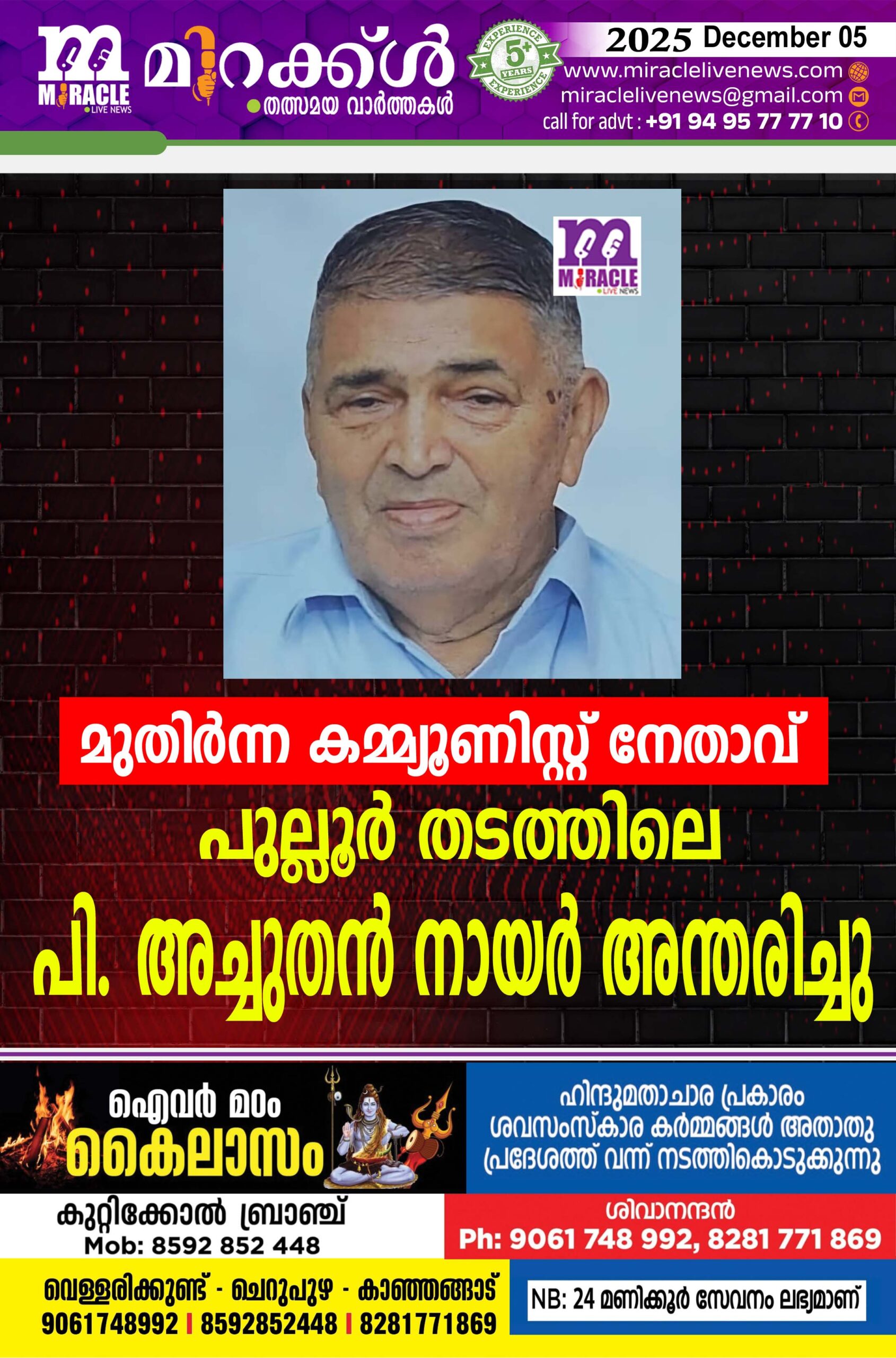 കാഞ്ഞങ്ങാട് : മുതിര്ന്ന കമ്മ്യൂണിസ്റ്റ് നേതാവ് പുല്ലൂര് തടത്തിലെ പി. അച്ചുതന് നായര് (81) അന്തരിച്ചു.തടത്തിലെ സിപിഎം മുന് ബ്രാഞ്ച് സെക്രട്ടറിയുമായിരുന്നു.ഭാര്യ: പരേതയായ വി.കല്ല്യാണി. മക്കള്: വി. വിജയകുമാര്, ഗിരിജ,ജയശ്രീ, രാജീവന് (ഗള്ഫ്) മരുമക്കള്: ഭാസ്ക്കരന്,കൊടക്കാട് ( റിട്ട എ ഇ ഒ ), ശ്രീധരന് (പടുപ്പ് എല്ഐസി, ശ്രീജ (ബല്ലത്ത് ) ,സൗമ്യ (ചെമ്മനാട്). സംസ്ക്കാരം നാളെ രാവിലെ 10 മണിക്ക് വീട്ടുവളപ്പില്.