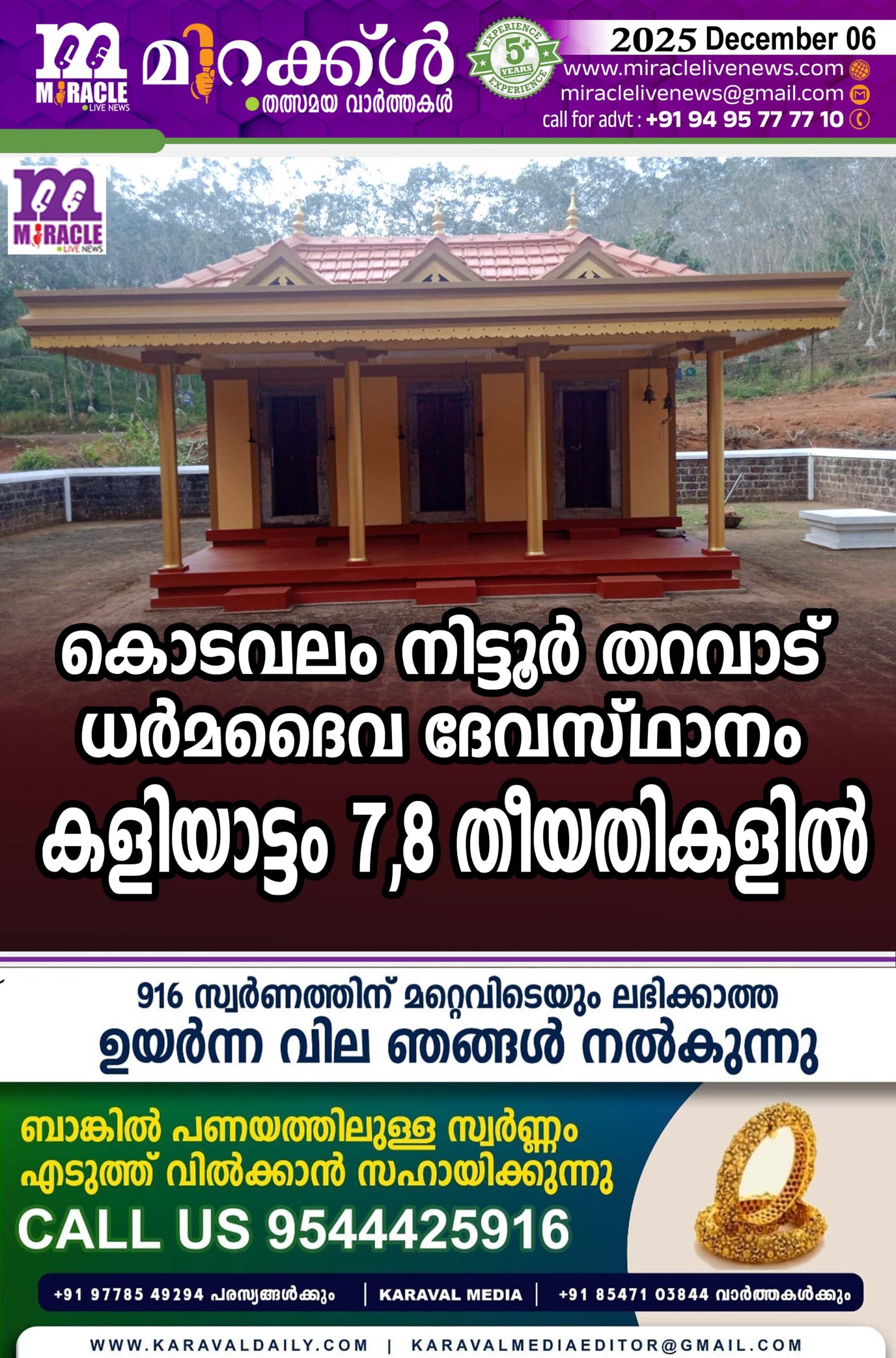 പുല്ലൂര് :കൊടവലം നിട്ടൂര് തറവാട് ധര്മദൈവ ദേവസ്ഥാനത്ത് : കളിയാട്ടം 7,8 തീയതികളില് നട ക്കും. 7ന് വൈകിട്ട് 6ന് ആദരവ് 2025 പരിപാടി നടക്കും. വിവിധ മേഖലകളില് മികവ് തെളിയിച്ച വരെ ചടങ്ങില് അനുമോദിക്കും. തുടര്ന്ന് കലാപരിപാടികള്. 7.30 ന് തെയ്യം കൂടല്. തുടര്ന്ന് വിഷ്ണുമൂര്ത്തിയുടെയും രക്തജാതകനീശ്വരന്റെയും മുളവന്നൂര് ഭഗവതിയുടെയും കു ളിച്ചുതോറ്റം, മോന്തിക്കോലം, ശ്രീ