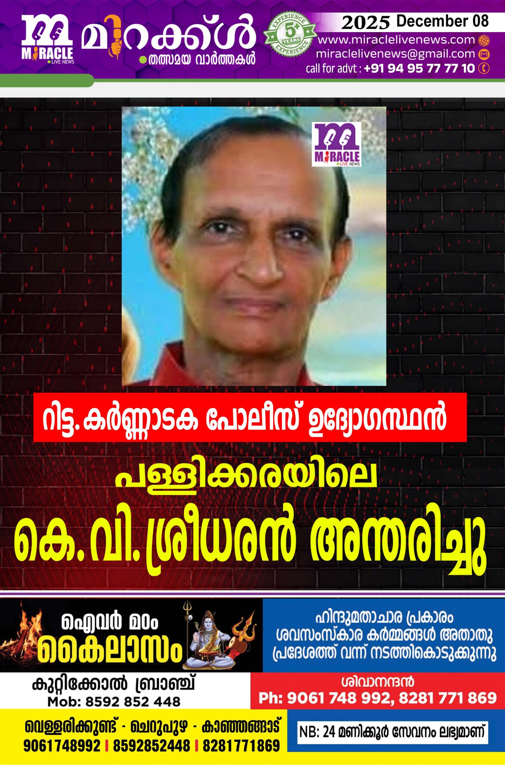 നീലേശ്വരം : പള്ളിക്കര കേണമംഗലം കഴകത്തിന് സമീപം തമാസിക്കുന്ന കെ. വി. ശ്രീധരന്(79)അന്തരിച്ചു. (റിട്ടേയേര്ഡ് കര്ണ്ണാടക പോലിസ്) ഭാര്യ ശോഭന (നീലേശ്വരം ) മക്കള് ജിതേന്ദ്ര (ബാംഗ്ലൂര്) ജിതേഷ് (ചെന്നൈ) ശ്രീജേഷ് ( കാനഡ) . മരുമക്കള്