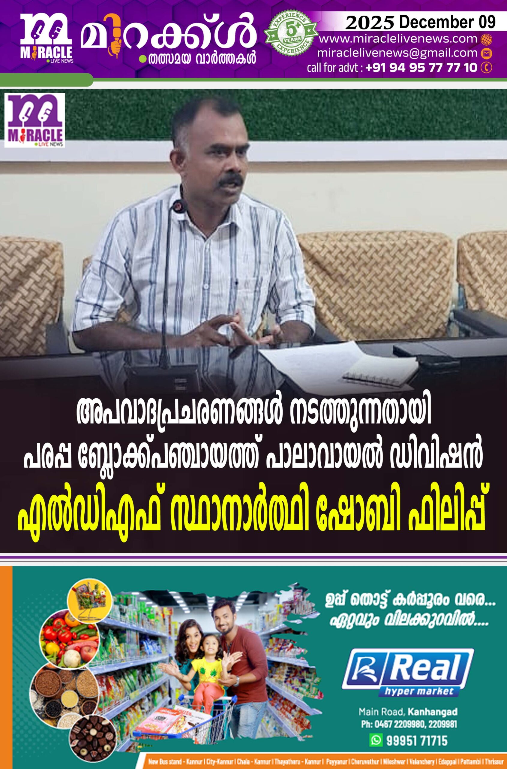 അപവാദ പ്രചരണങ്ങള്‍ നടത്തുന്നതായി പരപ്പ ബ്ലോക്ക് പഞ്ചായത്ത് പാലാവായല്‍ ഡിവിഷന്‍ എല്‍ഡിഎഫ് സ്ഥാനാര്‍ത്ഥി ഷോബി ഫിലിപ്പ്