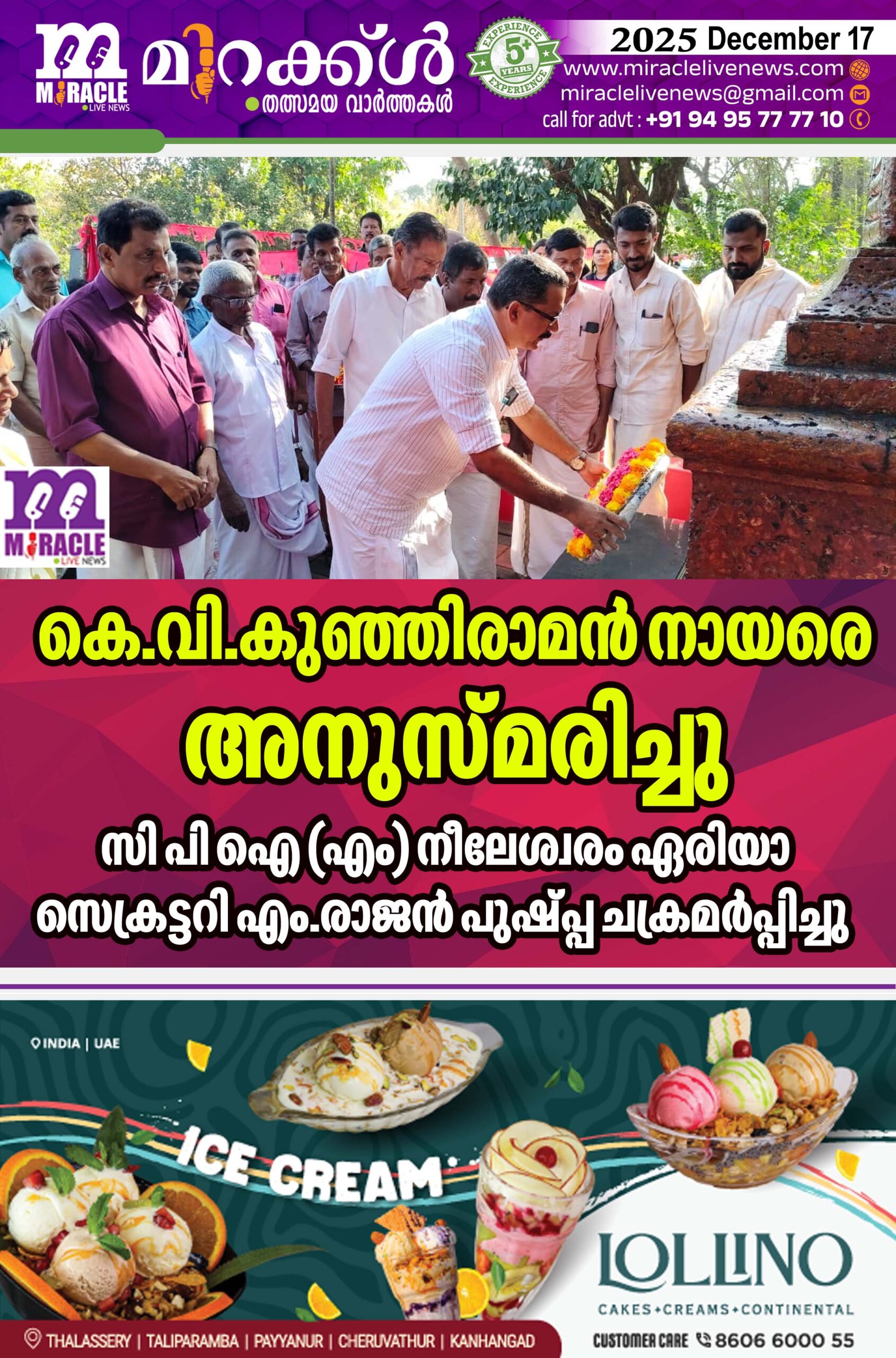 കരിന്തളം: സി പി ഐ (എം) നീലേശ്വരം ഏരിയാ ക്കമ്മറ്റി അംഗവും കര്‍ഷക സംഘം ജില്ലാ വൈസ് പ്രസിഡണ്ടും കിനാനൂര്‍ — കരിന്തളം പഞ്ചായത്ത് പ്രസിഡണ്ടുമായിരുന്ന കീഴ്മാലയിലെ കെ.വി.കുഞ്ഞിരാമന്‍ നായരുടെ ഒമ്പതാം ചരമവാര്‍ഷിക ദിനം സി പി ഐ (എം) കരിന്തളം വെസ്റ്റ് ലോക്കല്‍ ക്കമ്മറ്റിയുടെ നേതൃത്വത്തില്‍ ആചരിച്ചു. തലയടുക്കത്തെ സ്മാര സ്തൂപത്തില്‍ പുഷ്പ്പാര്‍ച്ചന നടത്തി. അനുസ്മരണയോഗം ഏരിയാ സെക്രട്ടറി എം.രാജന്‍ ഉല്‍ഘാടനം ചെയ്തു. ലോക്കല്‍ സെക്രട്ടറി കെ.ബാലചന്ദ്രന്‍ അധ്യക്ഷനായി. ഏരിയാക്കമ്മറ്റിയംഗം കെ. ലക്ഷ്മണന്‍ പതാകയുയര്‍ത്തി. പാറക്കോല്‍ രാജന്‍ കയനി മോഹനന്‍ എം.വി.രതീഷ് എന്നിവര്‍ സംസാരിച്ചു വി.തങ്കരാജന്‍ സ്വാഗതം പറഞ്ഞു.
