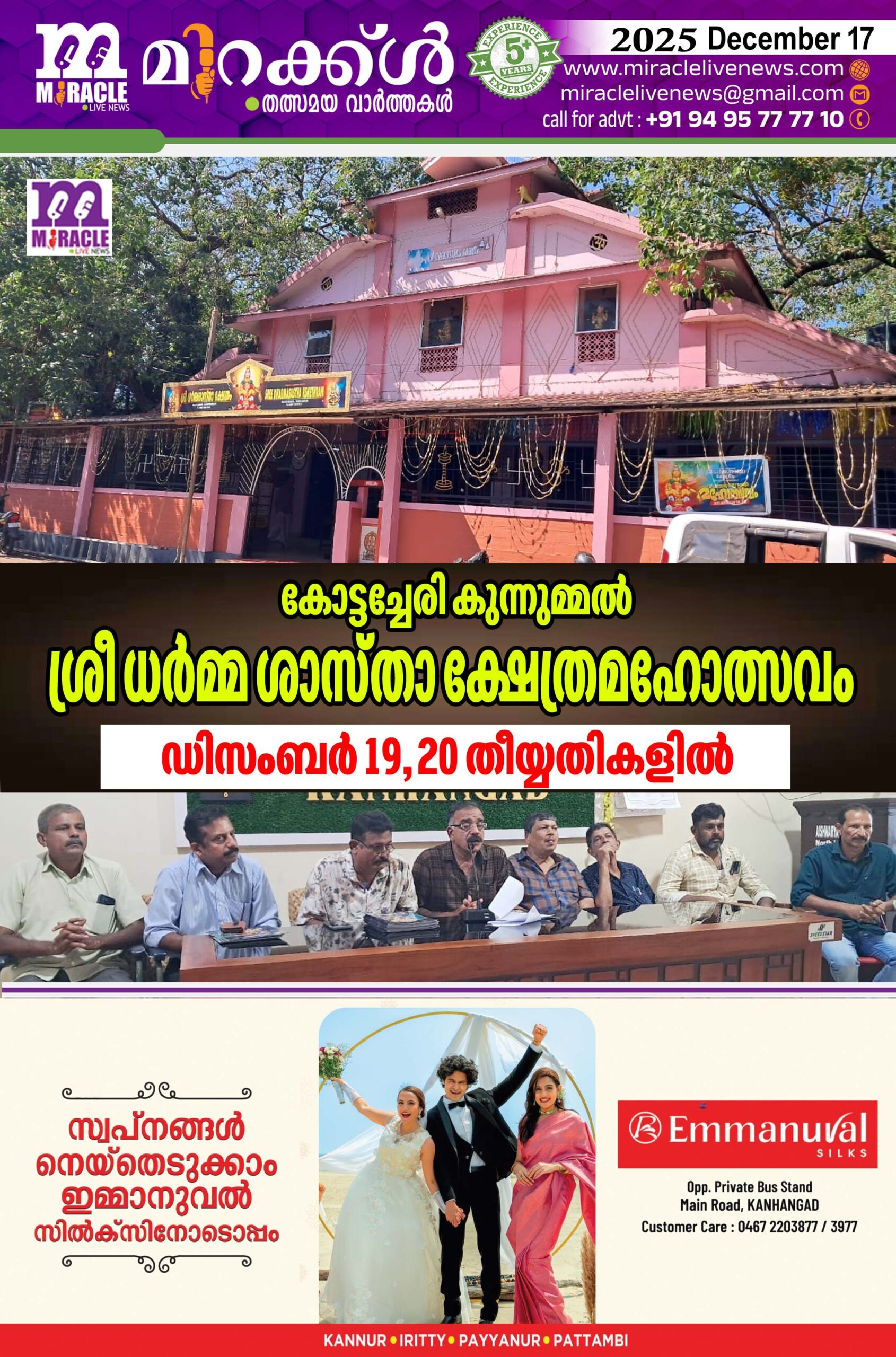 കോട്ടച്ചേരി കുന്നുമ്മല്‍ ശ്രീ ധര്‍മ്മ ശാസ്താ ക്ഷേത്ര മഹോത്സവം ഡിസംബര്‍ 19, 20 തീയ്യതികളില്‍