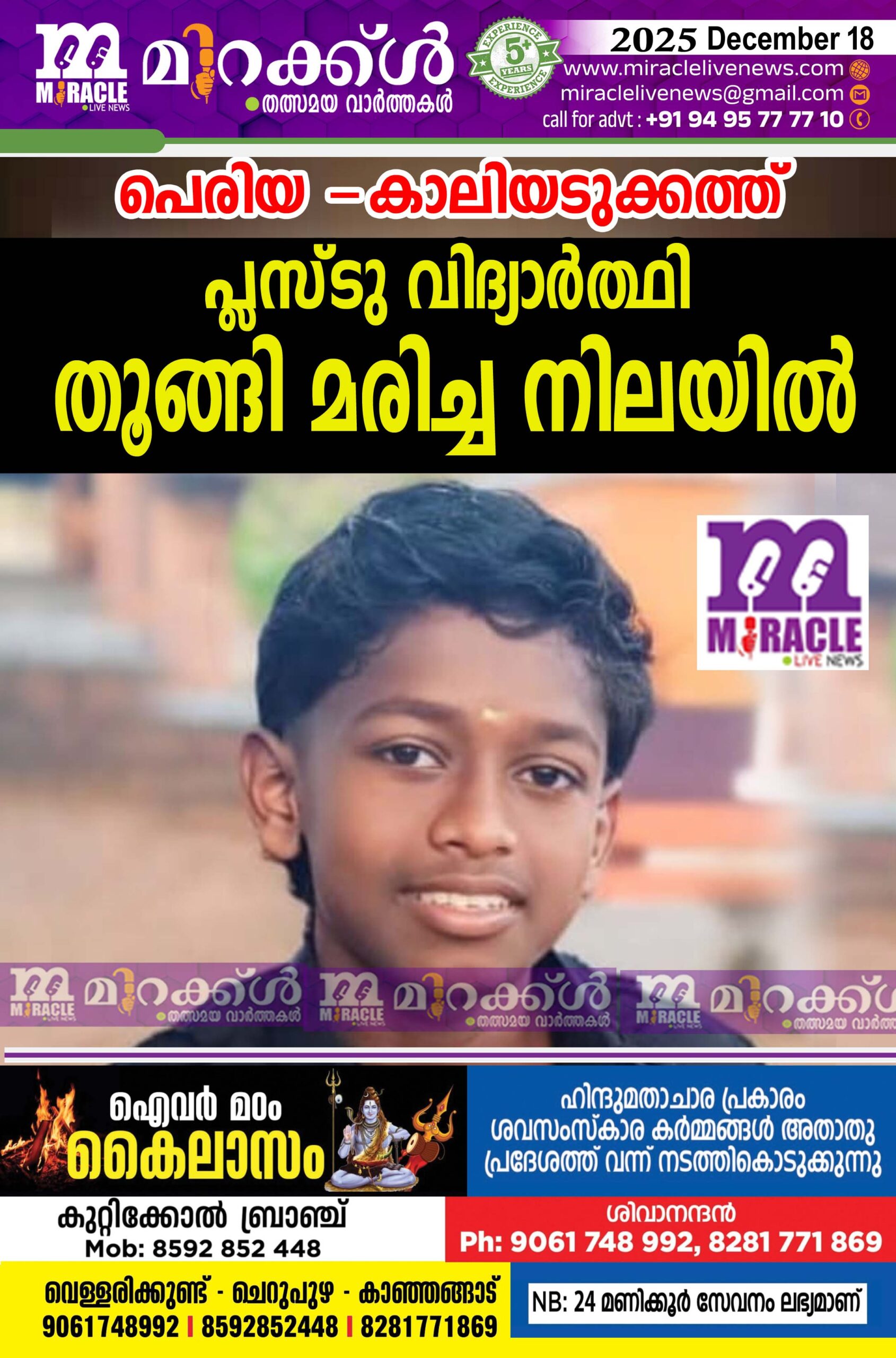 പെരിയ -കാലിയടുക്കത്ത് പ്ലസ്ടു വിദ്യാര്‍ത്ഥി തൂങ്ങി മരിച്ച നിലയില്‍