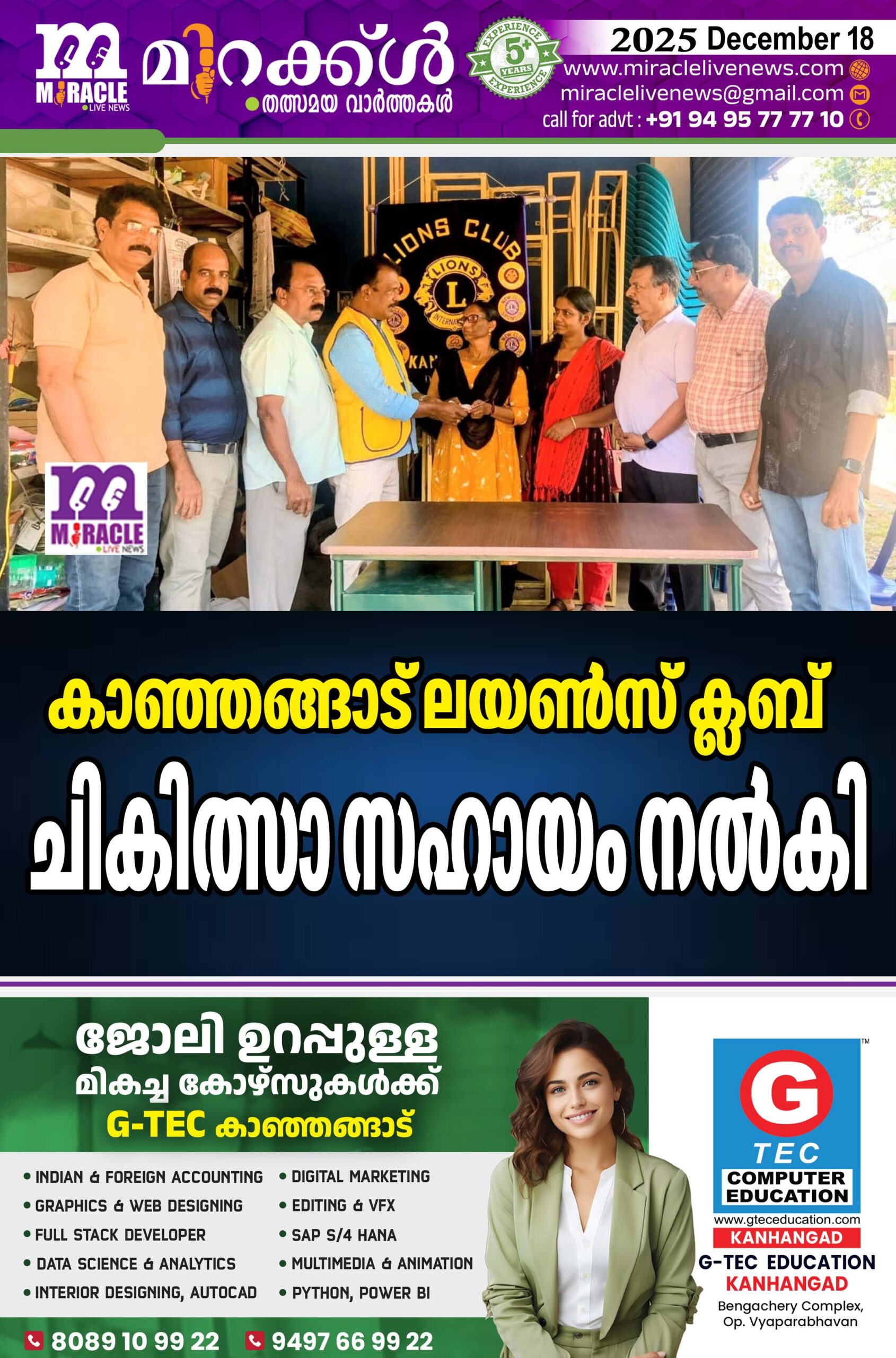 കാഞ്ഞങ്ങാട്:ക്യാന്സര് രോഗം ബാധിച്ച് ചികിത്സ തേടി വരുന്ന ഷൈമ പെരിയങ്ങാനം എന്നവര്ക്ക് കാഞ്ഞങ്ങാട് ലയണ്സ് ക്ലബ്ബിന്റെ സഹായം പ്രസിഡന്റ് കണ്ണന് പാര്ത്ഥസാരഥി നല്കി . ചടങ്ങില് സെക്രട്ടറി മധു മഠത്തില്, കെ ബാലകൃഷ്ണന് നായര് , എന് അനില്കുമാര്, സി വിജയന്, വില്യംസ് ജോസഫ്, എം ഗംഗാധരന് എന്നിവര് പങ്കെടുത്തു
