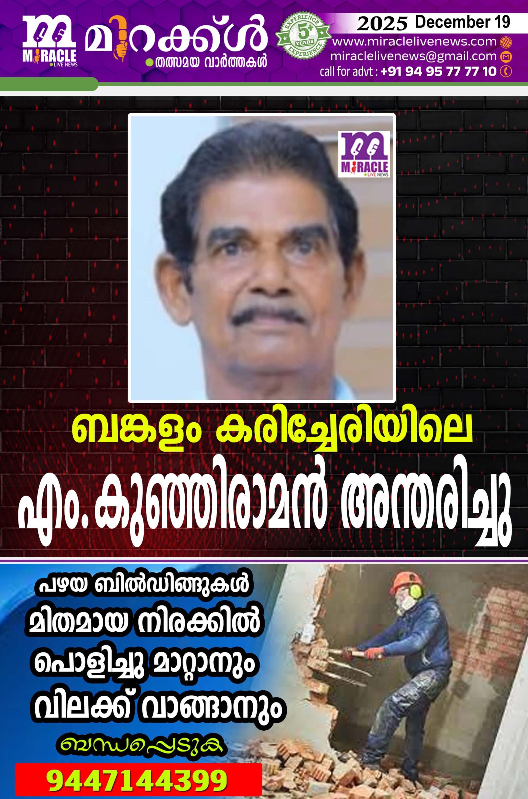 നീലേശ്വരം:നിര്മ്മാണതൊഴിലാളി ബങ്കളം കരിച്ചേരിയിലെ എം.കുഞ്ഞിരാമന് (പൊക്കന് 72) അന്തരിച്ചു. സി ഐ ടി യു സജീവ പ്രവര്ത്തകനായിരുന്നു.ഭാര്യ: പത്മാവതി. മക്കള്: സുധീഷ് (മടിക്കൈ സര്വീസ് സഹകരണ ബാങ്ക് പൂത്തക്കാല് ഇലക്ട്രിക്കല് സെക്ഷന് ജീവനക്കാരന്), സുജാത (എ എസ് ഐ വനിതാ സെല് കാസര്കോട്). സഹോദരങ്ങള്:ബാലന്,തമ്പായി, ശാരദ,ലീല പരേതനായ കുഞ്ഞമ്പു.