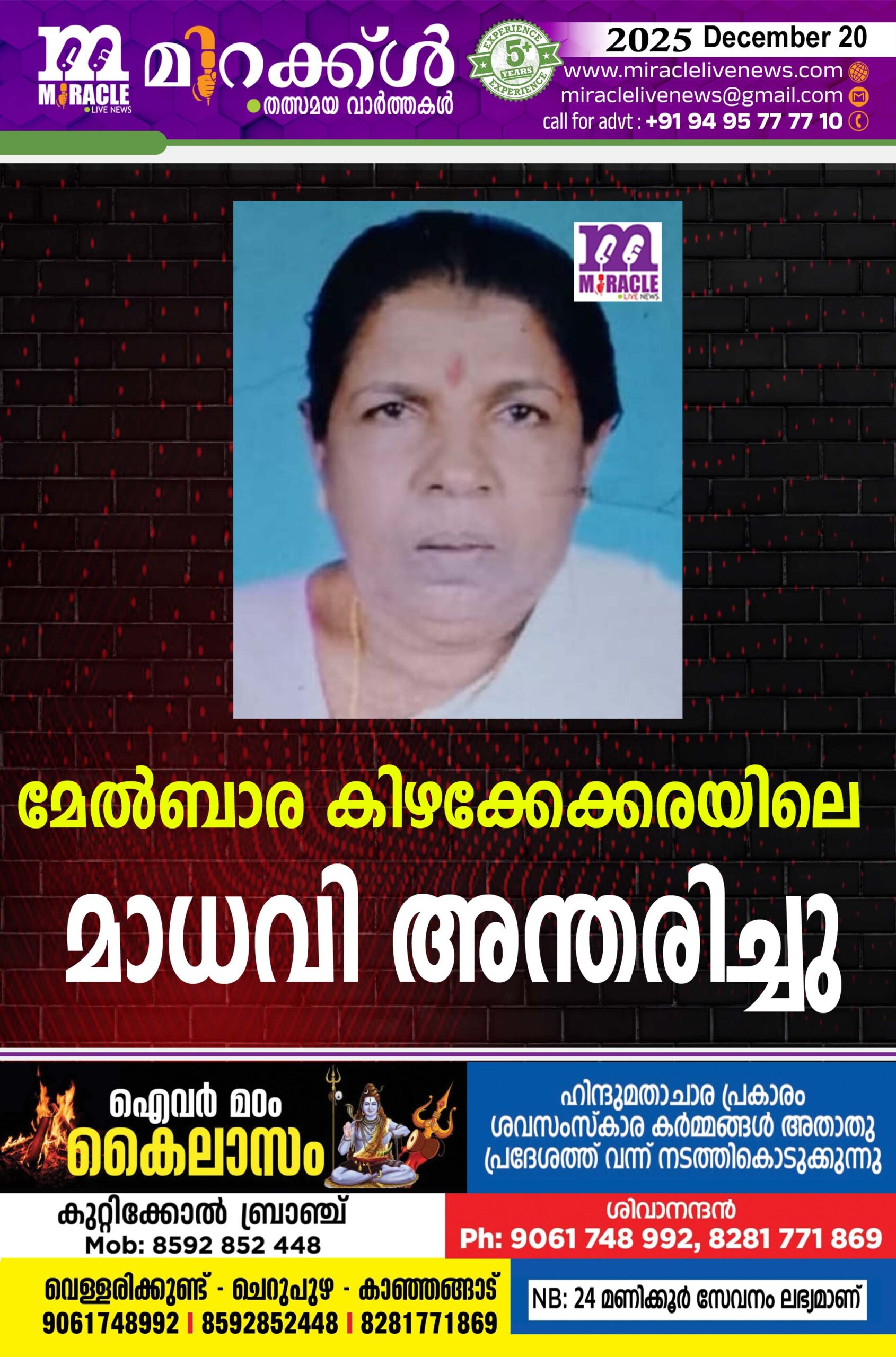 മേല്‍ബാര കിഴക്കേക്കരയിലെ മാധവി അന്തരിച്ചു
