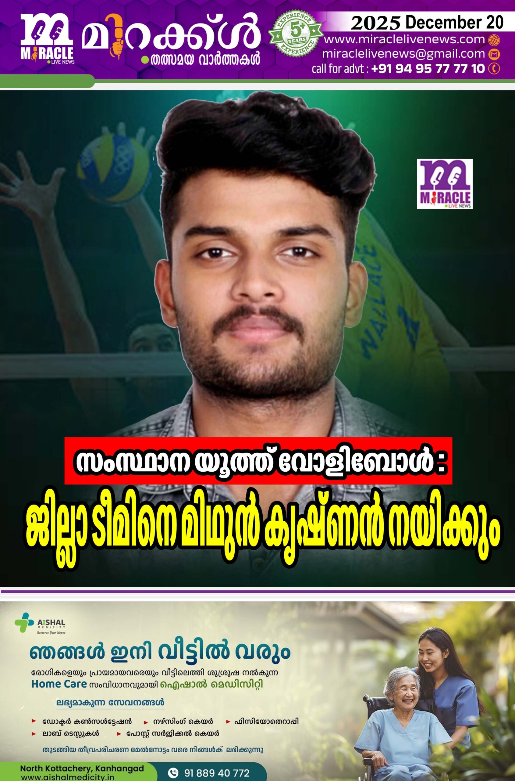 സംസ്ഥാന യൂത്ത് വോളിബോള്‍ : ജില്ലാ ടീമിനെ മിഥുന്‍ കൃഷ്ണന്‍ നയിക്കും