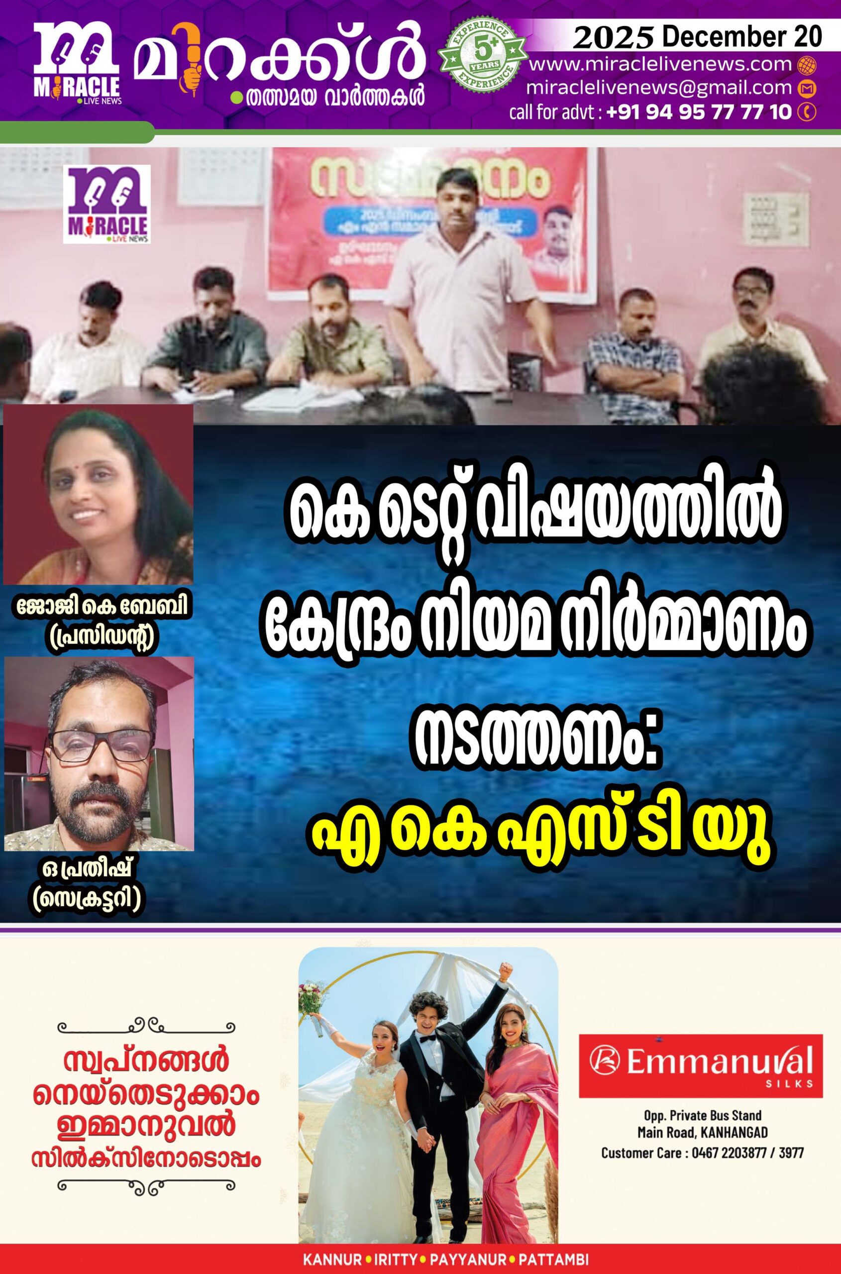 കാഞ്ഞങ്ങാട്: കെ ടെറ്റ് വിഷയത്തില്‍ സുപ്രീം കോടതി വിധിയെ തുടര്‍ന്ന് അധ്യാപകര്‍ പ്രതിസന്ധിയിലായതിനാല്‍ കേന്ദ്ര സര്‍ക്കാര്‍ വിഷയത്തില്‍ ഇടപെട്ട് നിയമ നിര്‍മ്മാണം നടത്തണമെന്ന് എ കെ എസ് ടി യു ഹോസ്ദുര്‍ഗ് ഉപജില്ലാ സമ്മേളനം പ്രമേയത്തിലൂടെ ആവശ്യ പ്പെട്ടു. നിശ്ചയിക്കപ്പെട്ട യോഗ്യത മാനദണ്ഡമാക്കി ജോലിയില്‍ കയറി പത്ത് വര്‍ഷത്തിലധികം സര്‍വീസ് നേടിയ പതിനായിരക്കണക്കിന് അധ്യാപകരുടെ ജോലിക്കാണ് സുപ്രീം കോടതി വിധി തടസ്സമായി നില്‍ക്കുന്നത്. ഈ വിഷയത്തില്‍ കേന്ദ്ര സര്‍ക്കാര്‍ നിയമ നിര്‍മ്മാണത്തിലൂടെ പ്രശ്‌ന പരിഹാരത്തിന് ശ്രമിക്കണമെന്നും സമ്മേളനം വിലയിരുത്തി. എ കെ എസ് ടി യു സംസ്ഥാന കൗണ്‍സിലംഗം ടി എ അജയകുമാര്‍ സമ്മേളനം ഉദ്ഘാടനം ചെയ്തു. ഉപജില്ല പ്രസിഡന്റ് വിനോദ് കല്ലത്ത് അധ്യക്ഷത വഹിച്ചു.