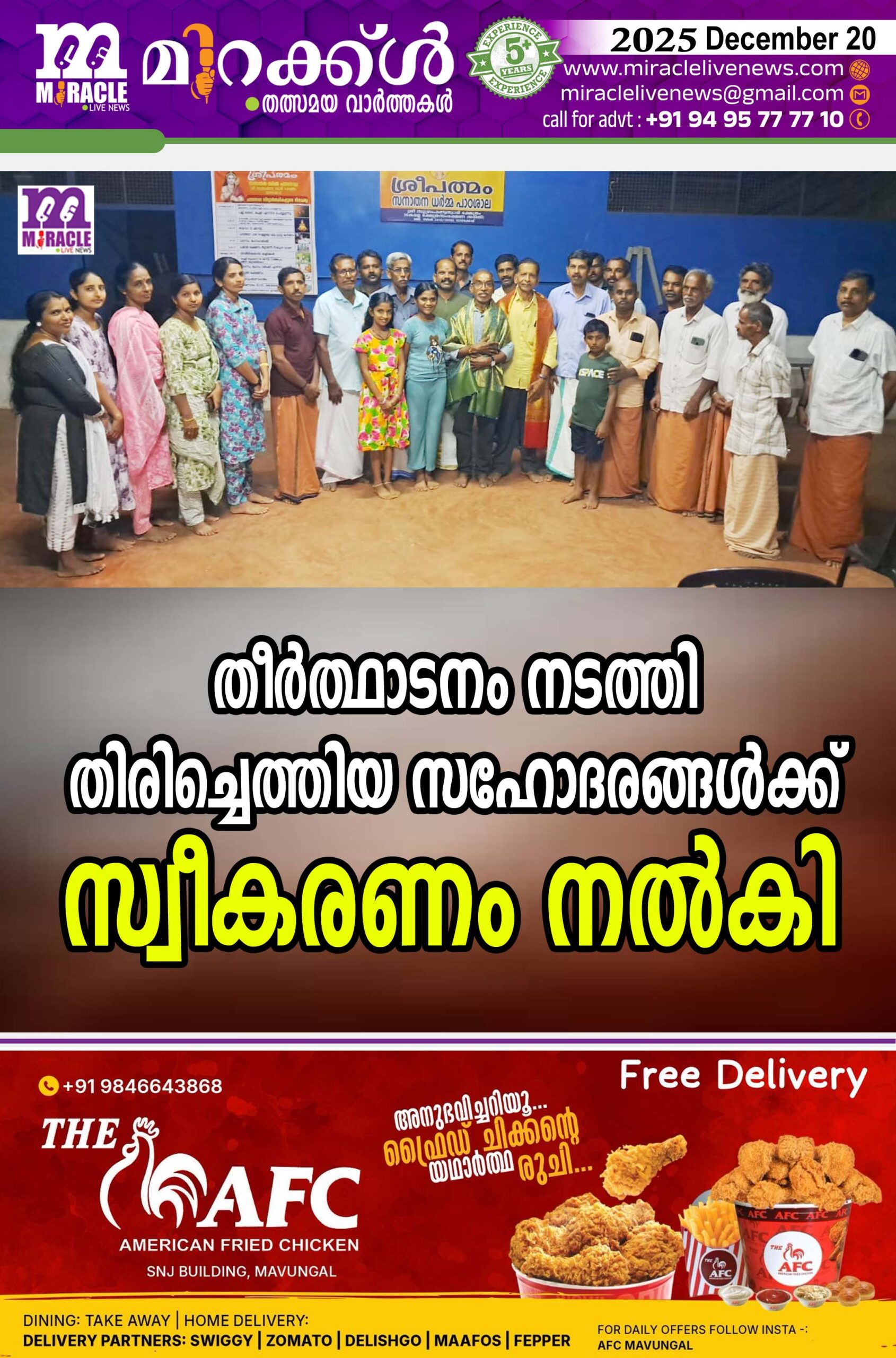 കോട്ടപ്പാറ: ആധുനിക യുഗത്തിലും രാമേശ്വരം മുതല് കാ ശി വരെ കാല്നടയായി തീര് ത്ഥാടനം പൂര്ത്തിയാക്കി തി രിച്ചെത്തിയ സഹോദരങ്ങള് സ്വീകരണം നല്കി. വാഴക്കോട് പുതുമന ഇല്ലത്തെ വി പി. വിഷ്ണു നമ്പൂതിരി,വി പി.പരമേശ്വരന് നമ്പൂതിരി എ ന്നിവര്ക്കാണ് നാട്ടുകാരുടെ നേതൃത്വത്തില് സ്വീകരണം ഒരുക്കിയത്. ആഗസ്റ്റ് 25 നാണ് രാമേശ്വരത്ത് സ്നാനം ചെയ്ത് അ വിടുന്ന് മണലെടുത്താണ് യാ ത്ര ആരംഭിച്ചത്. നവംബര് 29ന് കാശിയില് എത്തി. മണല് ഗംഗയില് നിക്ഷേപിച്ച് വിശ്വനാ ഥനെ തൊഴുത് ഗംഗസ്നാനം ചെയ്ത് ഗംഗാജലവുമായി തി രിച്ച് ട്രെയിന് മാര്ഗം ഡിസംബര് 13ന് രാമേശ്വരത്ത് അഭി ഷേകം ചെയ്താണ് തീര്ത്ഥാടന യാത്ര ഇവര് പൂര്ത്തീകരിച്ച ത്. 60 വയസ് കഴിഞ്ഞ ഇരുവരും 2400 ഓളം കിലോമീറ്ററുകള് താണ്ടി ലക്ഷ്യ സ്ഥലത്ത് എ ത്തിയത്. വാഴക്കോട് ക്ഷേത്ര പരിസരത്ത് നല്കിയ സ്വീകരണ ത്തില് ടി.നാരായണന്, ഓംപ്രകാശ്, എം.കുമാരന്, എം.ത മ്പാന്, മുരളി പുളിക്കാല്, ഉഷാ കുമാരന്, പി. ഇന്ദിര.ടി.സുകു മാരന് എന്നിവര് സംസാരിച്ചു.