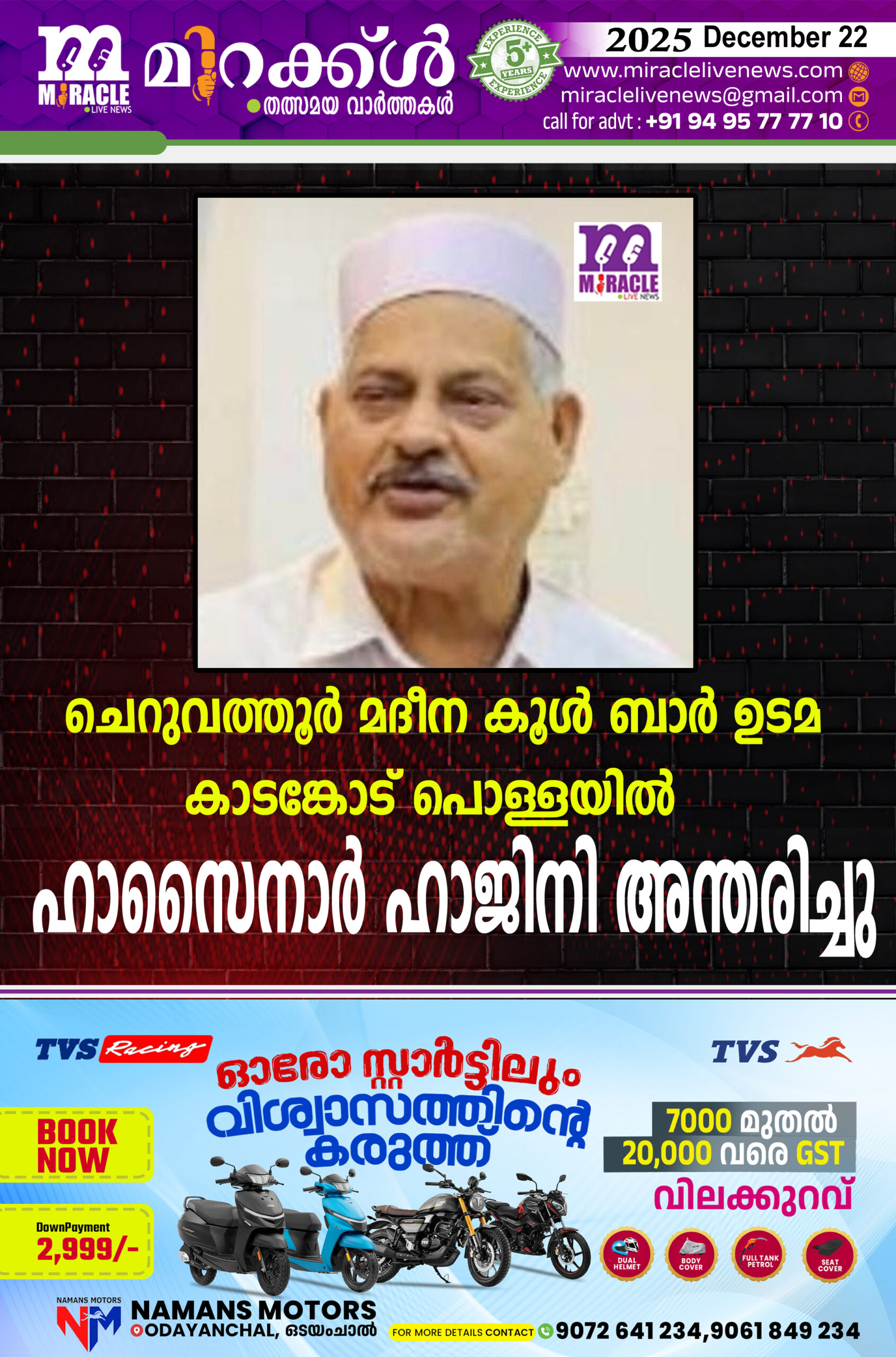 ചെറുവത്തൂര്‍ മദീന കൂള്‍ ബാര്‍ ഉടമ കാടങ്കോട് പൊള്ളയില്‍ ഹാസൈനാര്‍ ഹാജിനി അന്തരിച്ചു