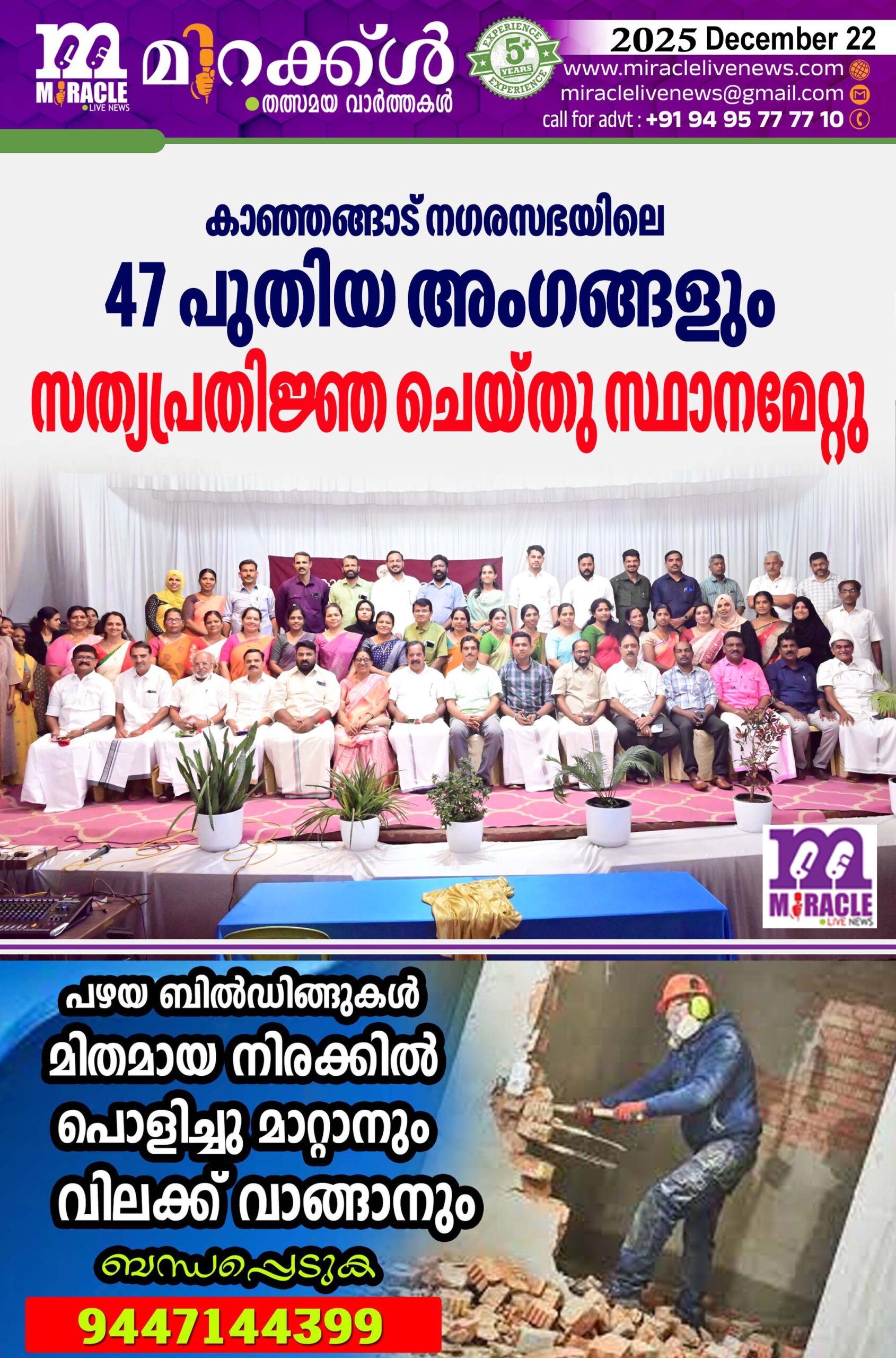 കാഞ്ഞങ്ങാട് : 2025-30 വര്ഷത്തേക്കുള്ള തദ്ദേശ സ്വയംഭരണ സ്ഥാപനങ്ങളിലേക്ക് നടന്ന തെരഞ്ഞെടുപ്പില് കാഞ്ഞങ്ങാട് നഗരസഭയില് നിന്നും തെരഞ്ഞെടുക്കപ്പെട്ട 47 ജനപ്രതിനിധികളും സത്യപ്രതിജ്ഞ ചെയ്ത് സ്ഥാനമേറ്റു. എല്ഡിഎഫ് 22, യുഡിഎഫ് 21, ബിജെപി 4 എന്നീ മുന്നണികളിലെ തെരഞ്ഞെടുക്കപ്പെട്ട പ്രതിനിധികളാണ് സത്യപ്രതിജ്ഞ ചെയ്തത്. റിട്ടേണിങ്ങ് ഓഫീസര്മാരായ ടി.ടി.സുരേന്ദ്രന്, ആര്. രോഹിന് രാജ് കെ.എ.എസ് ഇലക്ഷന് രജിസ്ട്രേഷന് ഓഫീസറും നഗരസഭാ സെക്രട്ടറിയുമായ എം.കെ.ഷിബു എന്നിവര് ചടങ്ങ് നിയന്ദ്രിച്ചു. മുതിര്ന്നെ അംഗം പി.വി.ചന്ദ്രനാണ് ആദ്യം സത്യപ്രതിഞ്ജ ചെയ്തത്. തുടര്ന്ന് അദ്ദേഹം മറ്റുള്ളവര്ക്ക് സ്ത്യ വാചകം ചൊല്ലിക്കൊടുത്തു. കാഞ്ഞങ്ങാട് നഗരസഭാ ടൗണ്ഹാളില് നടത്തിയ ചടങ്ങില് രാജ്മോഹന് ഉണ്ണിത്താന് എം.പി, കാഞ്ഞങ്ങാട് മണ്ഡലം എം.എല്.എ ഇ.ചന്ദ്രശേഖരന്, മുന് നഗരസഭാ ചെയര്പേഴ്സണ് കെ.വി.സുജാത, മുന് വൈസ് ചെയര്മാന് ബില്ടെക് അബ്ദുള്ള, മുന് ചെയര്മാന്മാര്, വൈസ് ചെയര്മാന്മാര്, സ്റ്റാന്റിങ്ങ് കമ്മിറ്റി ചെയര്മാന്മാര്, കൗണ്സിലര്മാര്, പൗരപ്രമുഖര്, രാഷ്ട്രീയ പാര്ട്ടി നേതാക്കള്, പൊതുജനങ്ങള് തുടങ്ങി അനേകം പേര് പരിപാടിയില് പങ്കെടുത്തു