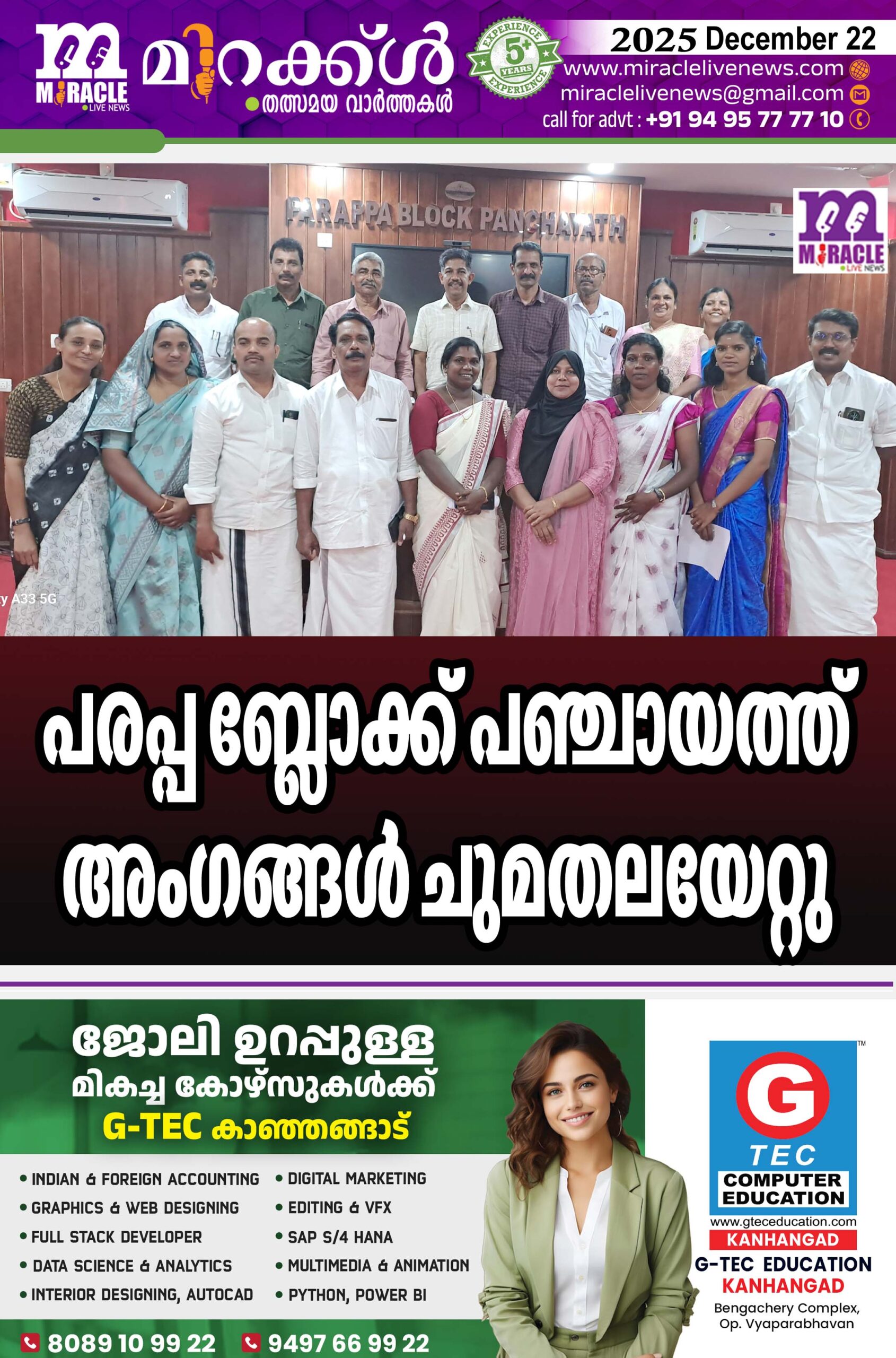 പരപ്പ : പരപ്പ ബ്ലോക്ക് പഞ്ചായത്തിലെ മുതിര്ന്ന അംഗം ഇ.ടി. ജോസിന് (എളേരി) വരണാധികാരി വി.പി. രഘു മണി സത്യവാചകം ചൊല്ലിക്കൊടുത്തു. സിനു കുര്യാക്കോസ് (കോടോം) നസീമ അബ്ദുളള (കള്ളാര്) ഭവ്യ രാജ് പ്രനത്തടി, ബി.സുരേഷ് പ്രാണത്തൂര്, ടെ സി ചാക്കോ ( മലോം ) ഏ.വി. ഭാസ്ക്കരന് (പാലാവയല്, സുജ അനീഷ് (ചിറ്റാരിക്കാല് സോണി പൊടിമറ്റം (കമ്പല്ലൂര് ) സഫീന ഫൈസല് (ബളാല് , കെ.പി. ചിത്രലേഖ ( പരപ്പ, പാറക്കോല് രാജന് ( കിനാനൂര് ) ബിന്ദു കൃഷ്ണന് ( ബാനം) ടി.കെ. ദീപ (തായ്യന്നൂര് ) പി.ഗംഗാധരന് (ബേളൂര് ) എന്നിവരും സത്യപ്രതിജ്ഞ ചെയ്ത് ചുമതലയേറ്റു.