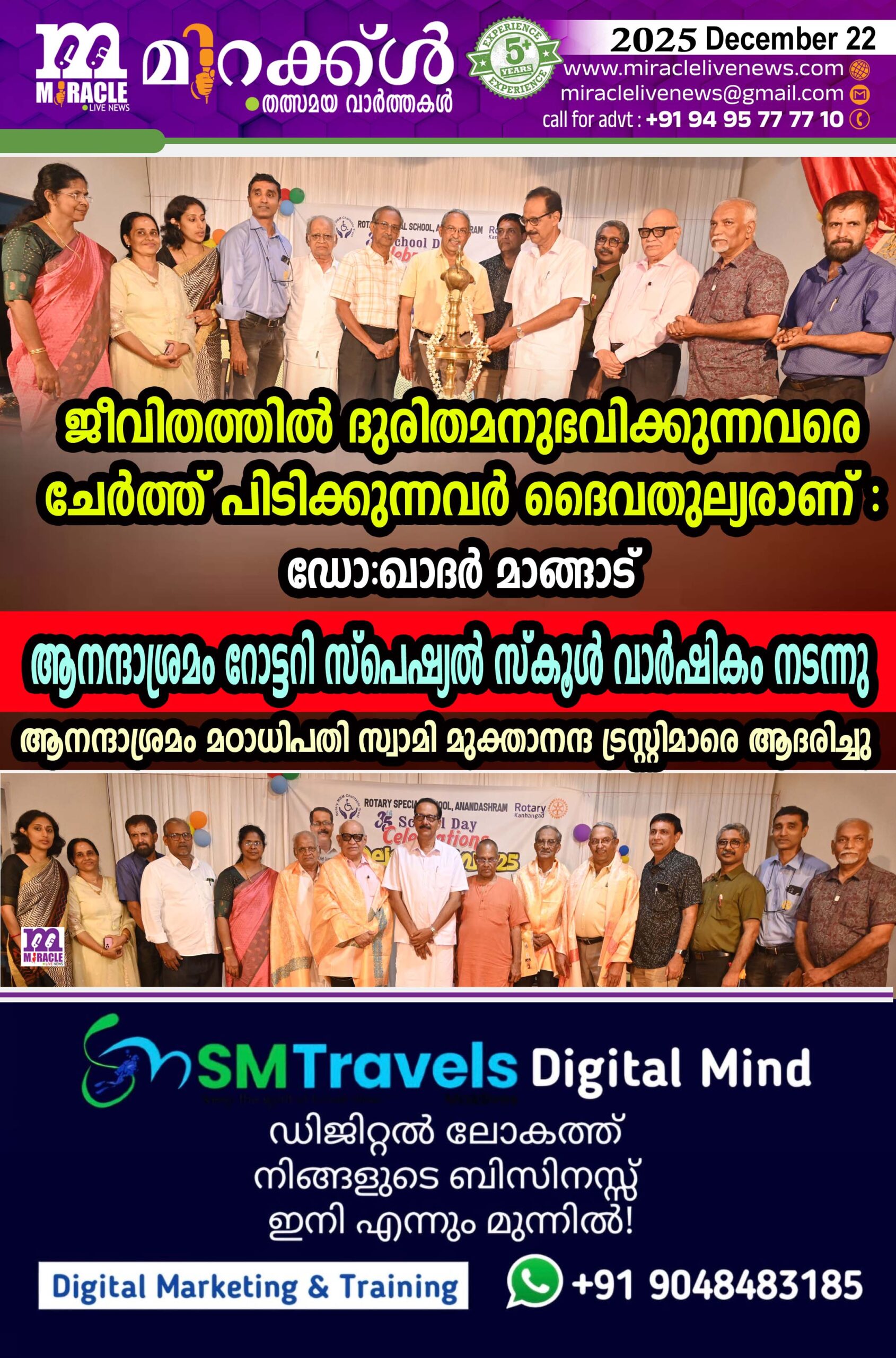 ജീവിതത്തില്‍ ദുരിതമനുഭവിക്കുന്നവരെ ചേര്‍ത്ത് പിടിക്കുന്നവര്‍ ദൈവതുല്യരാണ് ; ഡോ:ഖാദര്‍ മാങ്ങാട്: ആനന്ദാശ്രമം റോട്ടറി സ്‌പെഷ്യല്‍ സ്‌കൂള്‍ വാര്‍ഷികം നടന്നു; ആനന്ദാശ്രമം മഠാധിപതി സ്വാമി മുക്താനന്ദ ട്രസ്റ്റിമാരെ ആദരിച്ചു.