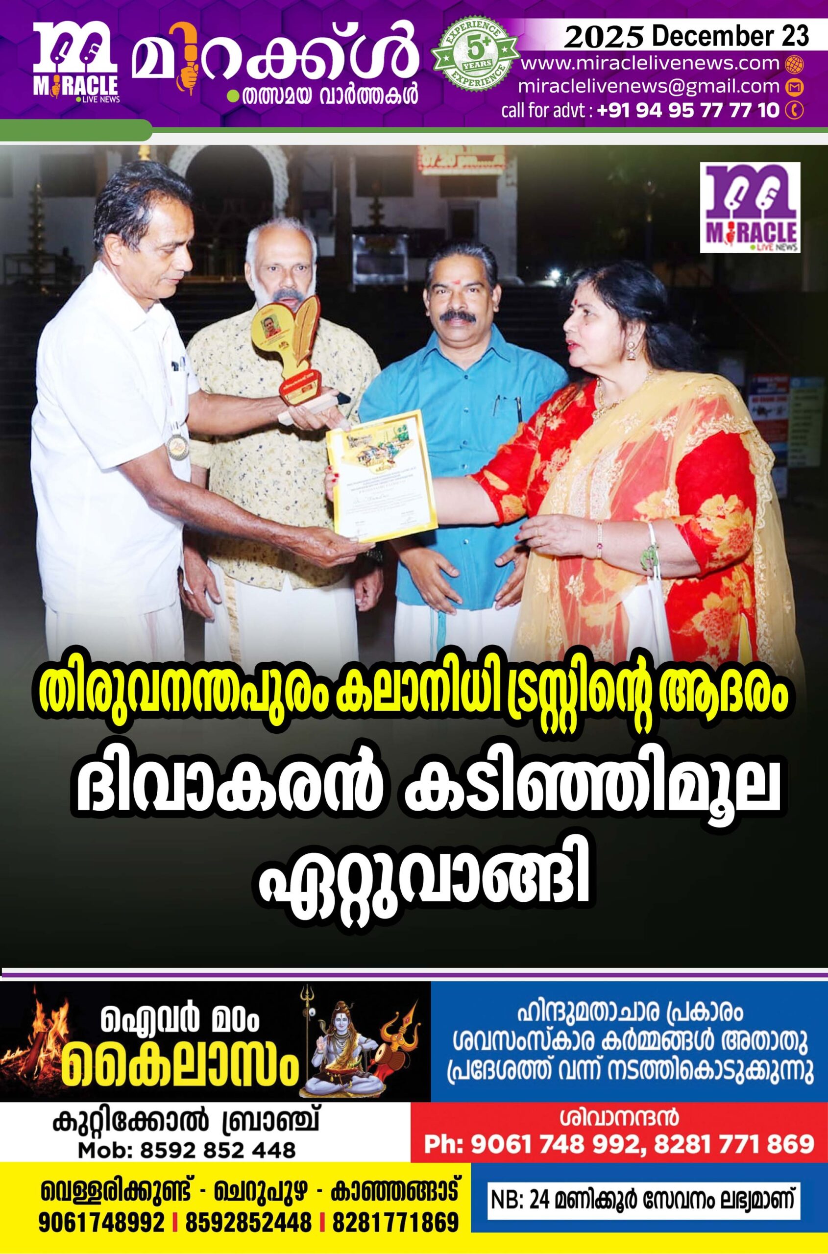 തിരുവനന്തപുരം കലാനിധി ട്രസ്റ്റിന്റെ ആദരം ദിവാകരന്‍ കടിഞ്ഞിമൂല ഏറ്റുവാങ്ങി