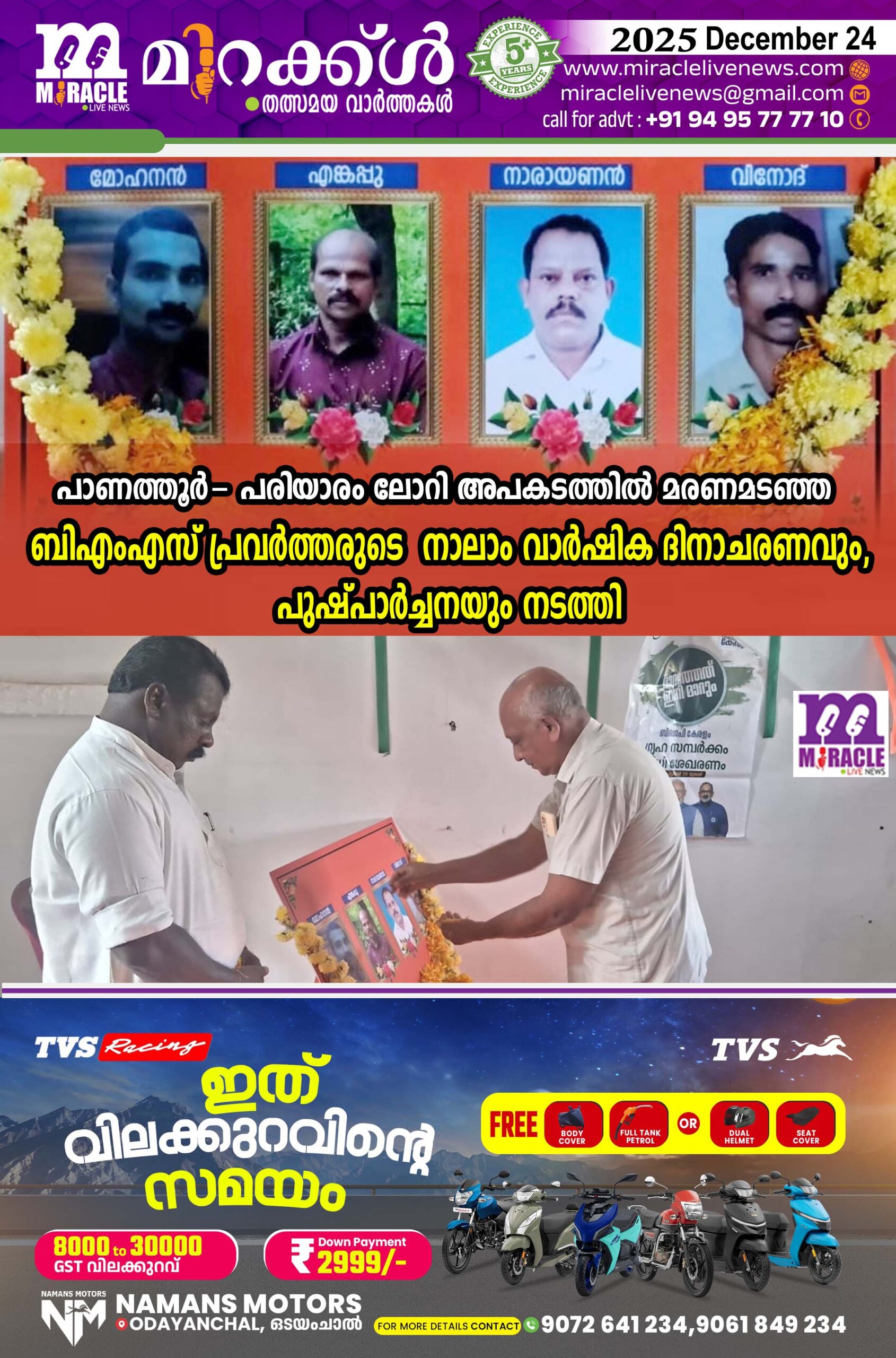 പാണത്തൂര് : നാടിനെയാകെ ദുഖത്തിലാക്കിയ പാണത്തൂര് പരിയാരത്തെ ലോറിയപകടം നടന്നിട്ട് നാല് വര്ഷം പൂര്ത്തിയാകുന്നു. 2021 ഡിസംബര് മാസം 23-ാം തീയതി കല്ലപ്പള്ളിയില് നിന്ന് മരം കയറ്റി പാണത്തൂരിലേക്കു വരികയായിരുന്ന ടോറസ് ലോറി മറിഞ്ഞ് പാണത്തൂര് കുണ്ടുപ്പള്ളി സ്വദേശികളായ നാലു തൊഴിലാളികള് സംഭവ സ്ഥലത്ത് വച്ച് തന്നെ മരണപ്പെട്ടിരുന്നു. സംഭവത്തില് ലോറി ഡ്രൈവര് ഉള്പ്പെടെ അഞ്ച് പേര്ക്ക് പരിക്കേറ്റിരുന്നു. ലോറി ഡ്രൈവറുടെ പിതാവായ ലോറി ക്ലീനര് പിന്നീട്ട് മരണപ്പെട്ടിരുന്നു. രക്ഷാപ്രവര്ത്തനത്തിലും, മരണപ്പെട്ടവരുടെ കുടുംബ സഹായ നിധിസമാഹരണത്തിലും നാടാകെ ഒറ്റക്കെട്ടായി പ്രവര്ത്തിച്ചിരുന്നു.