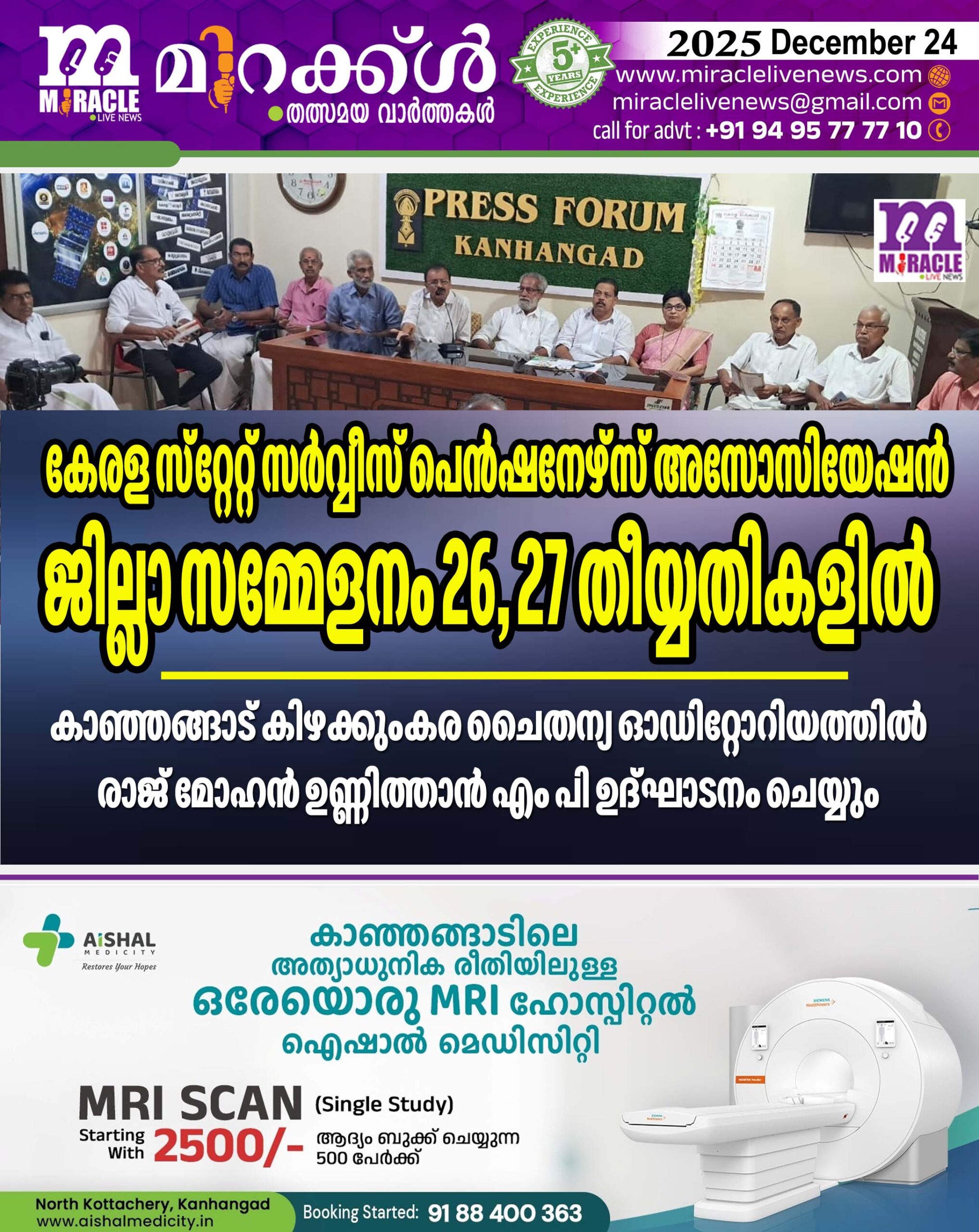 കേരള സ്റ്റേറ്റ് സര്‍വ്വീസ് പെന്‍ഷനേഴ്‌സ് അസോസിയേഷന്‍ ജില്ലാ സമ്മേളനം 26, 27 തീയ്യതികളില്‍; കാഞ്ഞങ്ങാട് കിഴക്കുംകര ചൈതന്യ ഓഡിറ്റോറിയത്തില്‍ രാജ് മോഹന്‍ ഉണ്ണിത്താന്‍ എം പി ഉദ്ഘാടനം ചെയ്യും