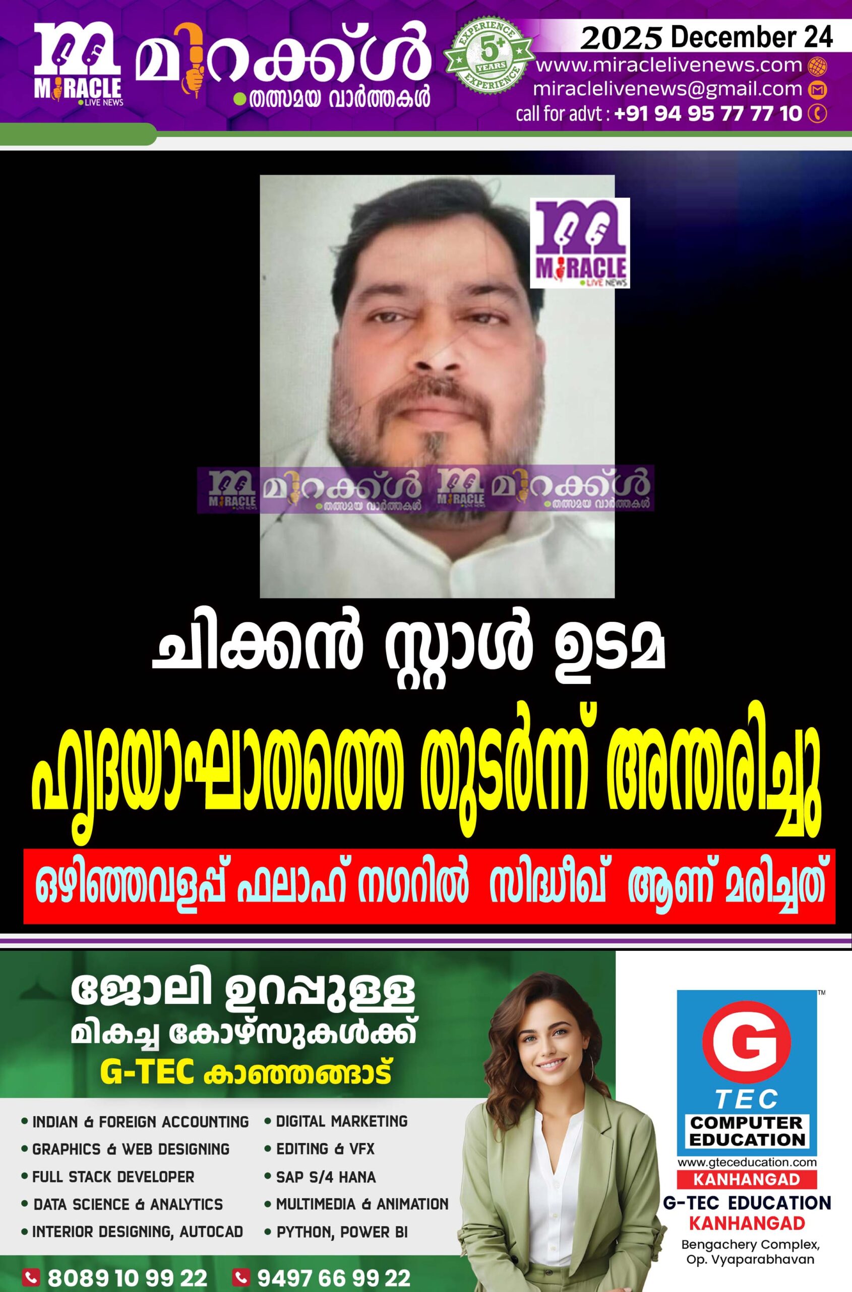 പടന്നക്കാട് : ചിക്കന് സ്റ്റാള് ഉടമ ഹൃദയാഘാതത്തെ തുടര്ന്ന് അന്തരിച്ചു. ഒഴിഞ്ഞവളപ്പ് ഫലാഹ് നഗറില് താമസിക്കുന്ന