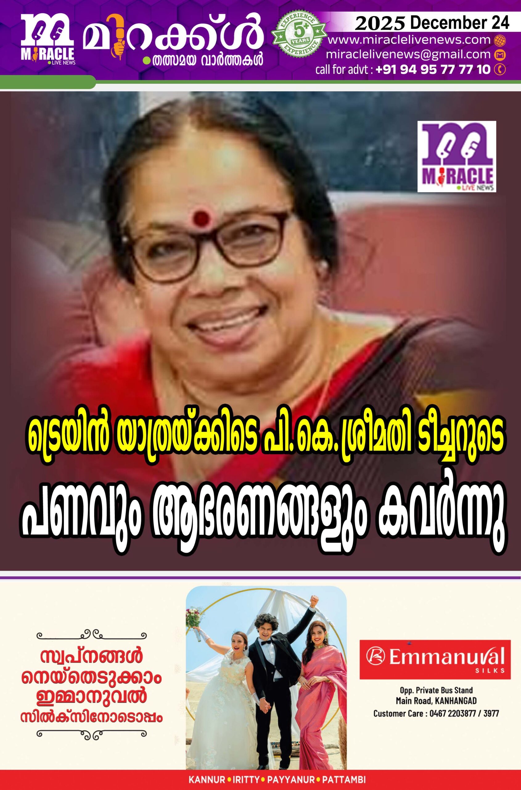 കണ്ണൂര്: മുതിര്ന്ന സിപിഎം നേതാവ് പി.കെ. ശ്രീമതിടീച്ചറുടെ ബാഗ് ട്രെയിന് യാത്രയ്ക്കിടെ കവര്ന്നു. മഹിളാ അസോസിയേഷന് സമ്മേളനം ഉദ്ഘാടനം ചെയ്യാന് കൊല്ക്കത്തയില് നിന്ന് സമസ്തി സ് പുരിലേക്ക് പോകുമ്പോഴായിരുന്നു കവര്ച്ച.