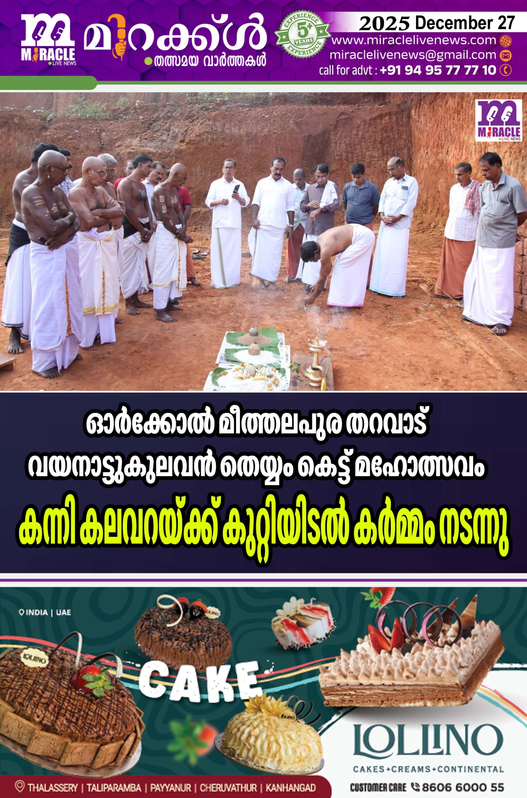 മടിക്കൈ : 28 വര്ഷങ്ങള്ക്ക് ശേഷംമടിക്കൈ ഓര്ക്കോല് പെരിയാങ്കോട്ട് ഭഗവതി ക്ഷേത്രത്തിന്റെ പരിധിയിലെ ഓര്ക്കോല് മീത്തലപുര തറവാട് ശ്രീ വയനാട്ടുകുലവന് ദേവസ്ഥാനം വയനാട്ടുകുലവന് തെയ്യം കെട്ട് മഹോത്സവത്തിന്റെ 2026 മാര്ച്ച് 6, 7, 8 തീയ്യതികളില് നടക്കും. മുന്നൊരുക്കങ്ങളുടെ ഭാഗമായി കന്നി കലവറയ്ക്കുള്ള കുറ്റിയിടല് കര്മ്മം നടന്നു. പൂത്തക്കാല്