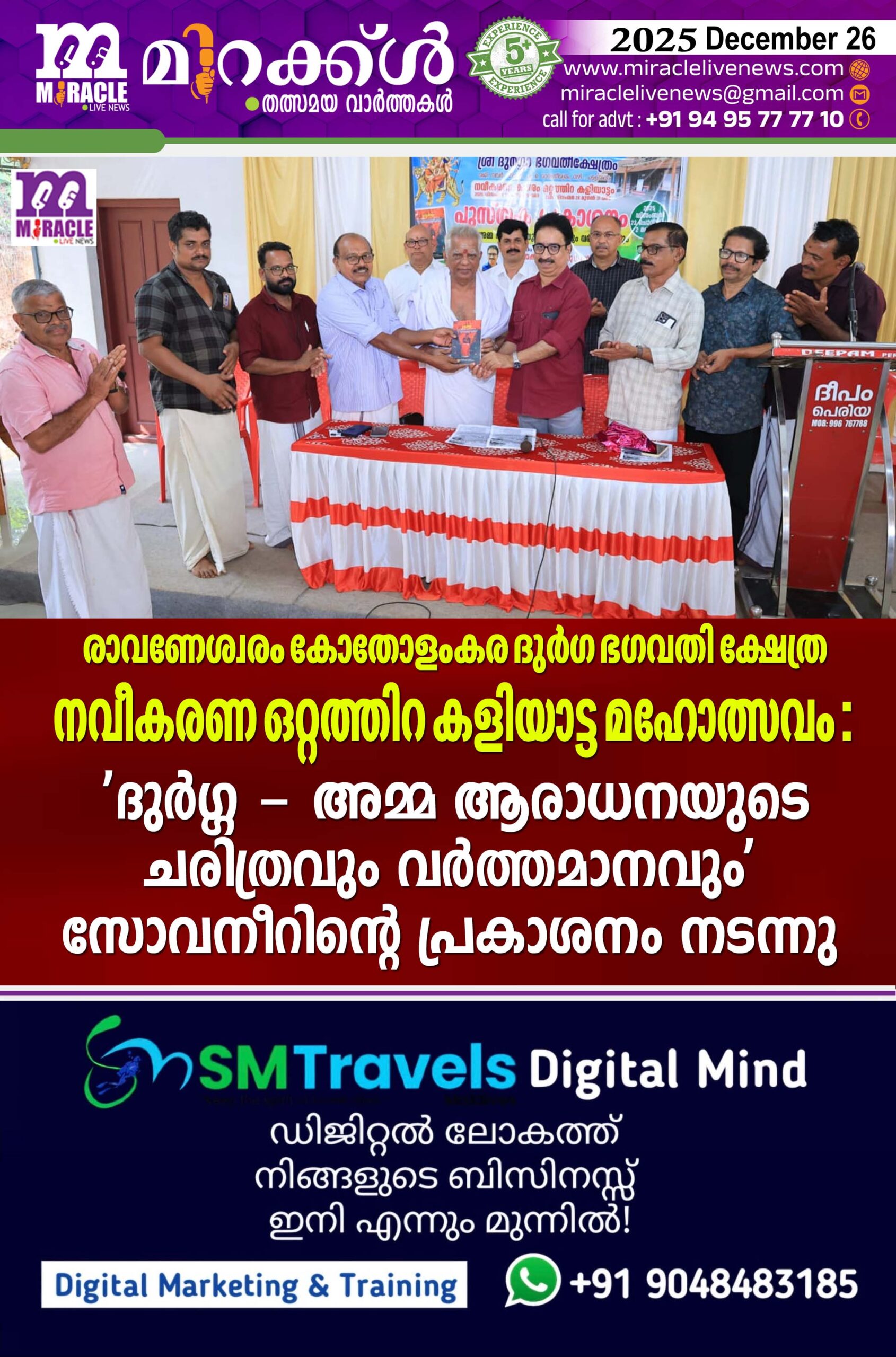 ‘ദുര്ഗ്ഗ – അമ്മ ആരാധനയുടെ ചരിത്രവും വര്ത്തമാനവും’ സോവനീറിന്റെ പ്രകാശനം നടന്നു. പ്രമുഖ എഴുത്തുകാരുടെ ലേഖനങ്ങളും കവിതകളും ഉള്പ്പെടുത്തി വിദ്യാര്ത്ഥികള്ക്കും ചരിത്രകാരന്മാര്ക്കും പൊതുജനങ്ങള്ക്കും അമ്മ ആരാധനയെക്കുറിച്ച് അറിവ് പകര്ന്നു നല്കുന്ന ഉത്തമ പുസ്തകമാണ് ദുര്ഗ അമ്മ ആരാധനയുടെ ചരിത്രവും വര്ത്തമാനവും. കവി ദിവാകരന് വിഷ്ണുമംഗലം അജാനൂര് ഗ്രാമ പഞ്ചായത്ത് മെമ്പര് എ. തമ്പാന് മക്കാകോടിന് നല്കി പുസ്തകത്തിന്റെ പ്രകാശനം നിര്വഹിച്ചു. രവീന്ദ്രന് രാവണേശ്വരം അധ്യക്ഷനായി. എന്. കേളു നമ്പ്യാര്, കപ്പണക്കാല് കുഞ്ഞിക്കണ്ണന് ആയത്താര്, അനീഷ് ദീപം, വി. വി. ഗോവിന്ദന്, എന്. അശോകന് നമ്പ്യാര്, അനീഷ് രാവണേശ്വരം, ബ്ലോക്ക് പഞ്ചായത്ത് മെമ്പര് രതീഷ് വെള്ളം തട്ട, കെ. വി പ്രവീണ്കുമാര് എന്നിവര് സംസാരിച്ചു.