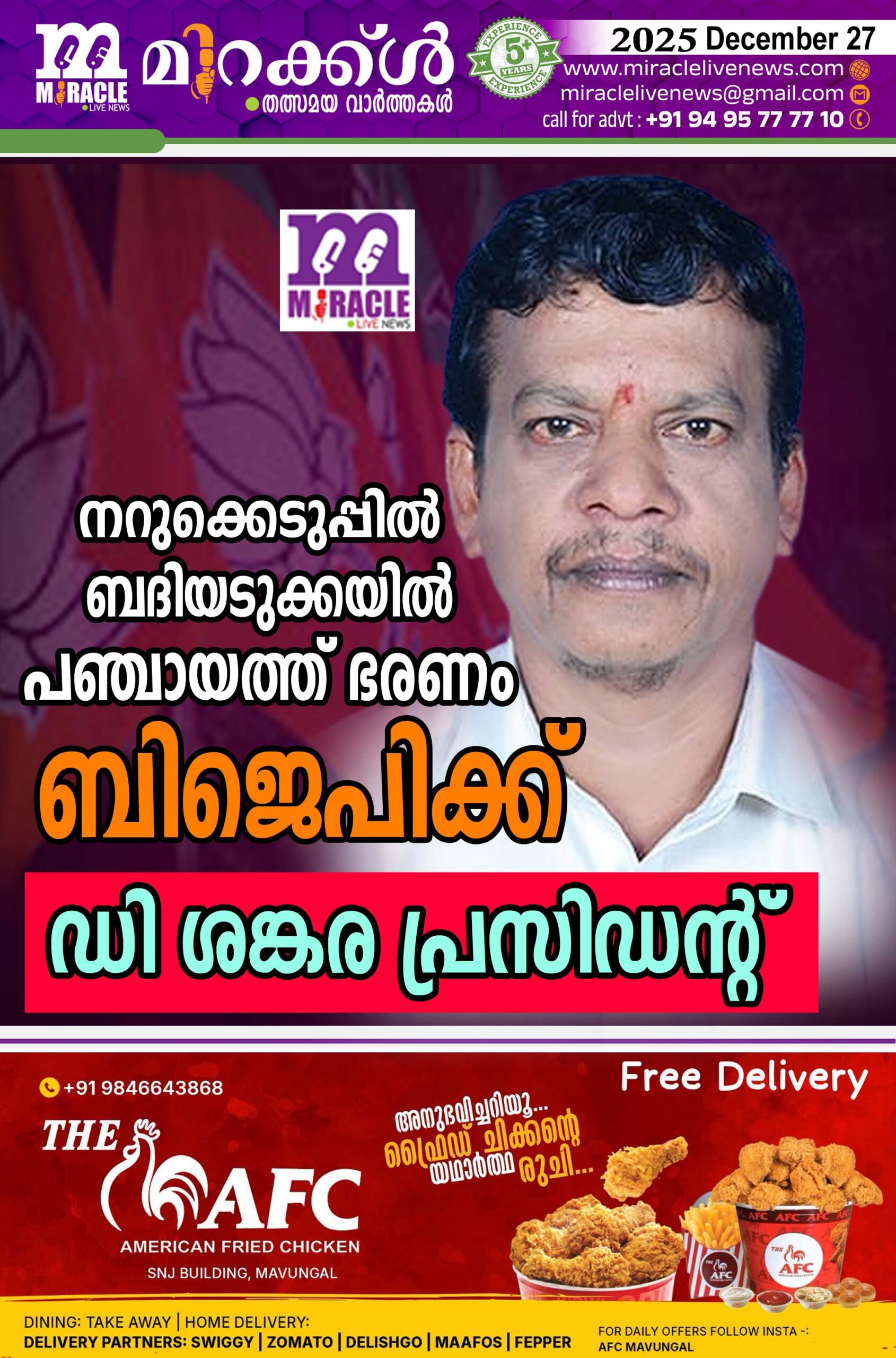 വിട്ടുനിന്നതിനെതുടര്ന്ന് നറുക്കെടുപിലൂടെയാണ് ബിജെപിയിലെ ഡി ശങ്കര തെരഞ്ഞടുക്കപ്പെട്ടത്.21 സീറ്റില് യുഡിഎഫ് 10, ബി ജെ പി 10 സിപിഎം 1 എന്നതായിരുന്നു സീറ്റ് നില .