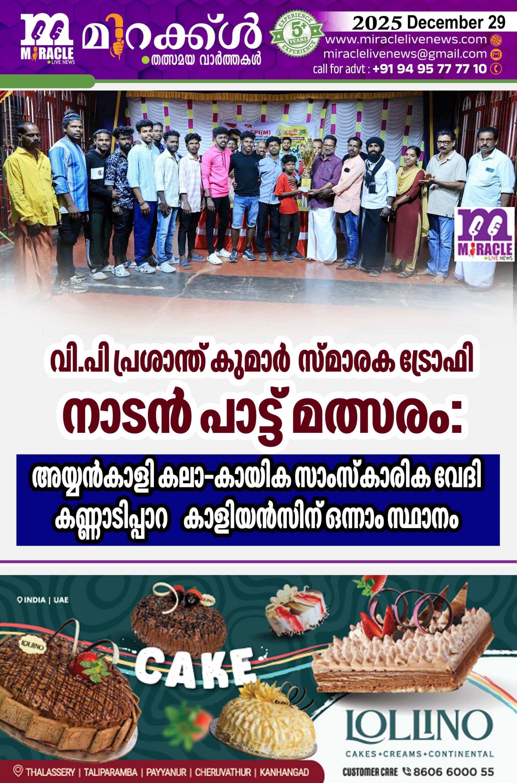 കാഞ്ഞങ്ങാട് :ജോളി യൂത്ത് സെന്റര്‍ അടോട്ട് , വെള്ളിക്കോത്ത് വി.പി. പ്രശാന്ത് കുമാര്‍ അനുസ്മരണത്തോടോപ്പം വി.പി പ്രശാന്ത് കുമാര്‍ സ്മാരക ട്രോഫി നാടന്‍ പാട്ട് മത്സരത്തില്‍ അയ്യന്‍കാളി കലാ-കായിക സാംസ്‌കാരിക വേദി കണ്ണാടിപ്പാറ കാളിയന്‍സ് (ഫോക്ക് ബാന്റ് ) ഒന്നാം സ്ഥാനം.