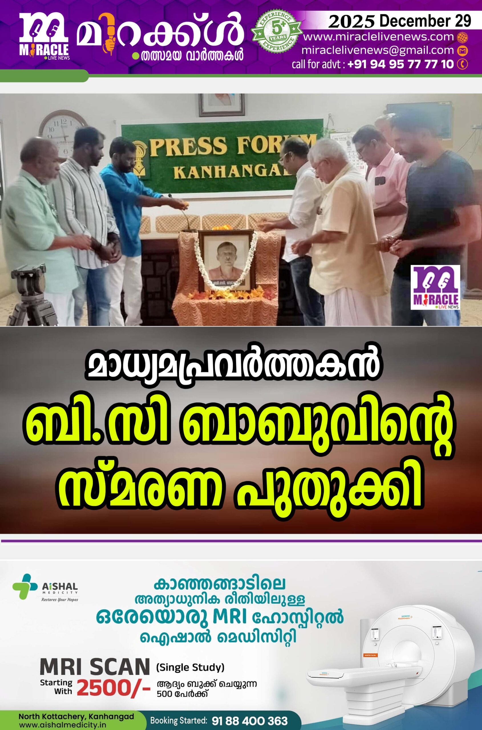 കാഞ്ഞങ്ങാട് : മാധ്യമപ്രവര്ത്തകന് ബി.സി ബാബുവിന്റെ സ്മരണ പുതുക്കി. ഏട്ടാം ചരമവാര്ഷികദിനത്തില് പ്രസ് ഫോറം ഹാളില് നടന്ന അനുസ്മരണം പുഷ്പാര്ച്ചന നടത്തി. പ്രസിഡന്റ് ഫസലുറഹ്മാന് അധ്യക്ഷനായി. സെക്രട്ടറി ബാബു കോട്ടപ്പാറ അനുസ്മരണ പ്രഭാഷണം നടത്തി. ടി.കെ നാരായണന്, ടി. മുഹമ്മദ് അസ്ലം, കെ. എസ്. ഹരി, ജോയ് മാരൂര്, എം. കുഞ്ഞിരാമന്, എന് ഗംഗാധരന് എന്നിവര് സംസാരിച്ചു.