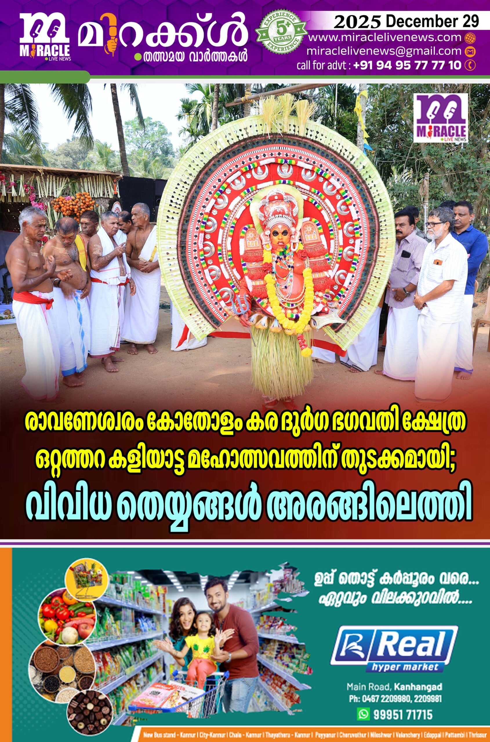 രാവണേശ്വരം: കോതോളം കര ദുര്ഗ്ഗ ഭഗവതി ക്ഷേത്ര ത്തില് നടന്നുവരുന്ന ഒറ്റത്തിറ കളിയാട്ട മഹോത്സവത്തിന്റെ ഭാഗമായി ഡിസംബര് 29ന് തിങ്കളാഴ്ച രാവിലെ മുതല് വിവിധ തെയ്യങ്ങള് അരങ്ങിലെത്തി. രക്തജാതന്, അടുക്കത്ത് ചാമുണ്ഡി, വിഷ്ണുമൂര്ത്തി, മുളവന്നൂര് ഭഗവതി എന്നീ തെയ്യങ്ങളാണ് ഒറ്റത്തിറ കളിയാട്ട മഹോത്സവം നടക്കുന്ന കുഞ്ഞി പറമ്പ് സന്നിധിയില് അരങ്ങില് എത്തിയത്. രാത്രി കിടങ്ങലും വിവിധ തെയ്യങ്ങളുടെ തോറ്റവും എഴുന്നള്ളത്തും നടന്നു. തുടര്ന്ന് നാരന്തട്ട തറവാട്ടില് പൊട്ടന് തെയ്യം കൂടലും, രക്തജാതന്റെ പുറപ്പാടും പുലര്ച്ചെ പൊട്ടന് തെയ്യത്തിന്റെ പുറപ്പാടും നടന്നു.കലാ പരിപാടികളും അരങ്ങേറി. ഡിസംബര് 30ന് വിവിധ തെയ്യങ്ങള് അരങ്ങിലെത്തും. ഒറ്റത്തിറ കളിയാട്ട മഹോത്സവം ഡിസംബര് 31ന് സമാപിക്കും