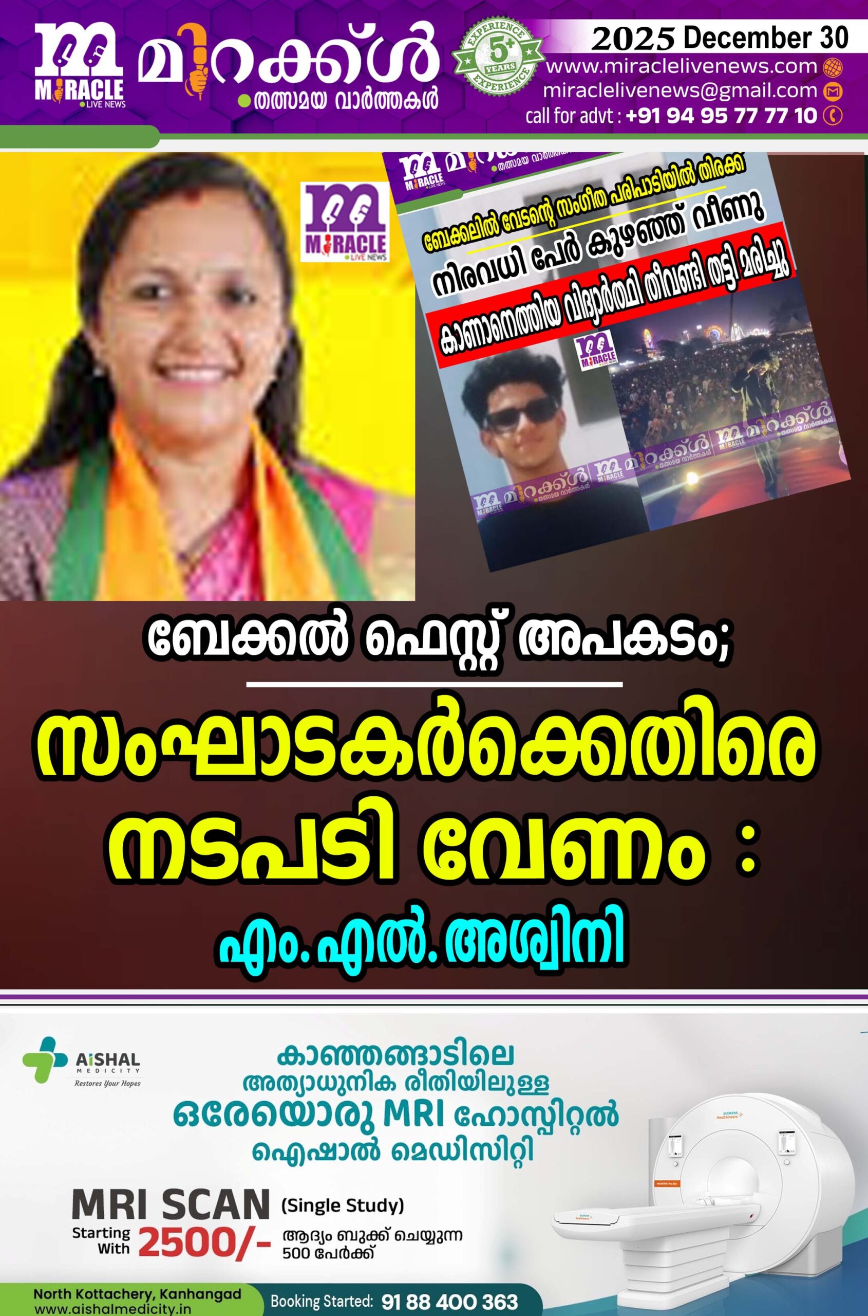കാസര്കോട്: ബേക്കല് ബീച്ച് ഫെസ്റ്റിനിടെ തിക്കിലും തിരക്കിലും പെട്ട് നിരവധി പേര്ക്ക് പരിക്കേല്ക്കുകയും പൊയിനാച്ചി സ്വദേശിയായ യുവാവ് ട്രെയിന് തട്ടി മരിക്കുകയും ചെയ്ത സംഭവത്തില് സംഘാടകര്ക്കെതിരെ കര്ശന നടപടി വേണമെന്ന് ബിജെപി കാസര്കോട് ജില്ലാ പ്രസിഡന്റ് എം.എല്. അശ്വിനി ആവശ്യപ്പെട്ടു. ക്രിസ്തുമസ് അവധിക്കാലമായതിനാല് വലിയ ജനത്തിരക്കാണ് ബേക്കല് ഫെസ്റ്റ് ഏരിയയില് അനുഭവപ്പെടുന്നത്. സംഗീതപരിപാടി വീക്ഷിക്കാന് വലിയ ജനക്കൂട്ടം ഉണ്ടാകുമെന്നറിഞ്ഞിട്ടും തിരക്ക് നിയന്ത്രിക്കാന് കാര്യമായ മുന്കരുതലുകള് സംഘാടകരുടെ ഭാഗത്ത് നിന്നോ വേണ്ട സുരക്ഷാ ക്രമീകരണങ്ങള് സ്വീകരിക്കാന് ജില്ലാ ഭരണകൂടത്തിന്റെ ഭാഗത്ത് നിന്നോ ഇടപെടലുണ്ടാകാത്തത് വലിയ വീഴ്ച്ചയാണ്. കഴിഞ്ഞ മാസം നവംബര് 23 ന് കാസര്കോട് നഗരത്തില് ഹനാന് ഷായുടെ സംഗീത പരിപാടിക്കിടെ സമാനമായ അപകടം ഉണ്ടായിട്ടും അതില് നിന്നും പാഠം ഉള്ക്കൊള്ളാന് ജില്ലാ ഭരണകൂടം തയ്യാറായില്ലെന്നതിന്റെ തെളിവാണ് ബേക്കലിലെ അപകടമെന്നും അശ്വിനി ചൂണ്ടിക്കാട്ടി.