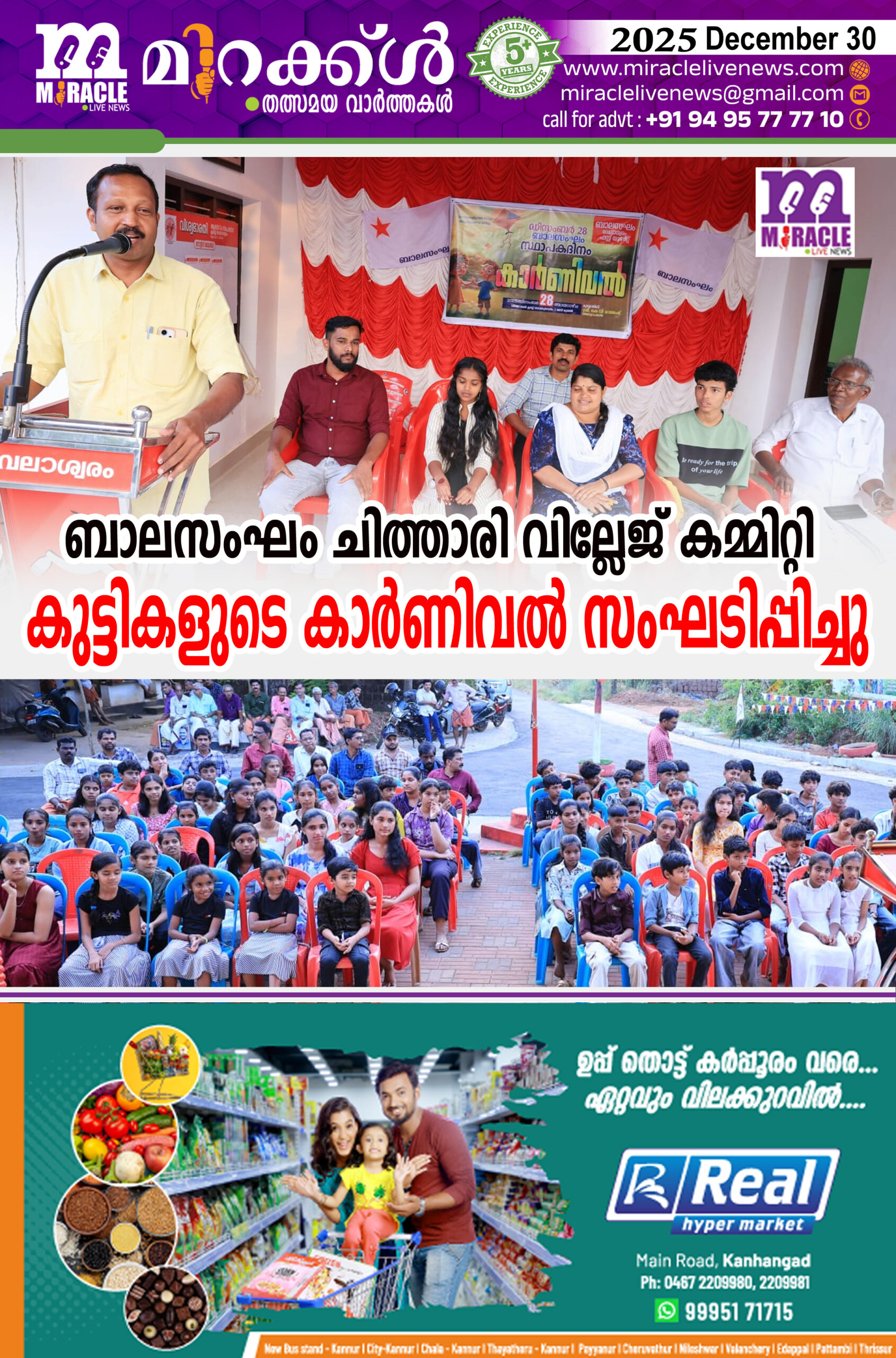കാഞ്ഞങ്ങാട്:ബാലസംഘം സ്ഥാപകദിനചാരണത്തിത്തിന്റെ ഭാഗമായി ചിത്താരി വില്ലേജ് കമ്മിറ്റി കുട്ടികളുടെ കാര്ണിവല് സംഘടിപ്പിച്ചു. വേലാശ്വരം വിശ്വാഭാരതി ക്ലബ്ബില് നടന്ന പരിപാടി ബാലസംഘം മുന് ജില്ലാ വൈസ് പ്രസിഡന്റും അധ്യാപകനുമായ കെ. വി. രാജേഷ് ഉത്ഘാടനം ചെയ്തു. വില്ലേജ് പ്രസിഡന്റ് തേജിമ അധ്യക്ഷയായി. പി കൃഷ്ണന് , കെ വി സുകുമാരന് , ദീപ പ്രവീണ്, തേജസ്സ് ആര്, സുരേന്ദ്രന് പി, ജ്യോതിഷ് ടി.പി, കുമാരന് കെ. വി, നയനേഷ്, അഭിരാജ് എന്നിവര് സംസാരിച്ചു. സംഘാടക സമിതി ചെയര്മാന് ഷനില്, പി സ്വാഗതവും ഹരിചന്ദ് നന്ദിയും പറഞ്ഞു. കുട്ടികളുടെ വിവിധ കലാപരിപാടികളും അരങ്ങേറി. സ്ഥാപകദിനത്തിന്റ ഭാഗമായി യൂണിറ്റുകളില് പതാകയുയര്ത്തലും നടന്നു.