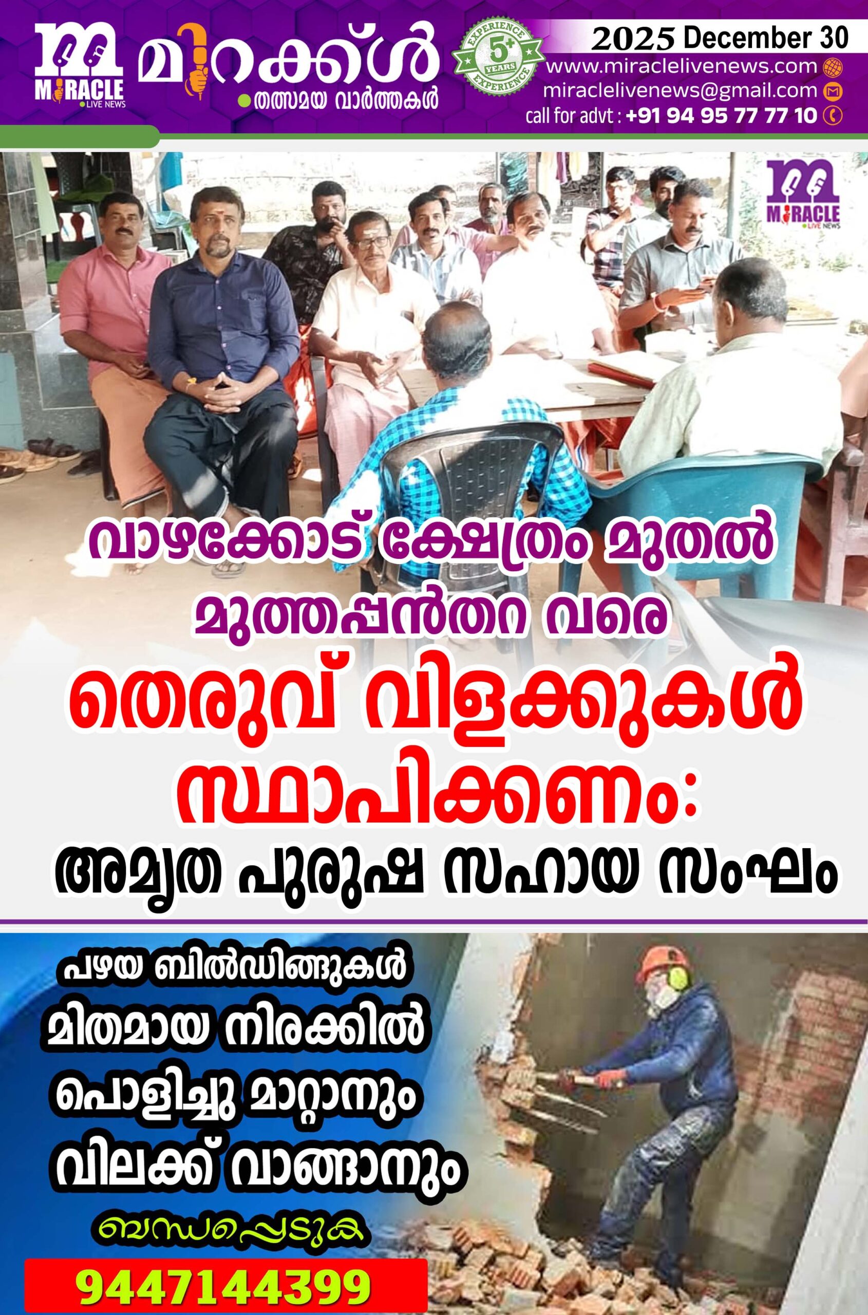 കോട്ടപ്പാറ: വാഴക്കോട് ക്ഷേത്രം മുതല് മുത്തപ്പന് തറവരെ തെരുവ് വിളക്കുകള് സ്ഥാപിക്കണമെന്ന് അമൃത പുരുഷ സഹായ സംഘം വാര്ഷിക യോഗം ആവശ്യപ്പെട്ടു. യോഗത്തില് എ. സന്ദീപ് അദ്ധ്യക്ഷത വഹിച്ചു.പി. വി . കൃഷ്ണന് സംഘത്തിന്റെ പ്രവര്ത്തനങ്ങളെ കുറിച്ച് സംസാരിച്ചു. ബി.രാഘവന് സ്വഗതവം വി.വി ഉണ്ണികൃഷ്ണന് നന്ദിയും പറഞ്ഞു. പുതിയ ഭാരവാഹികളായി ടി വി രാമകൃഷ്ണന് (പ്രസിഡന്റ് ) , എം. കൃഷ്ണന് (സെക്രട്ടറി), എന് നാരായണന് (ട്രഷറര്) എന്നിവരെ തെരഞ്ഞെടുത്തു.