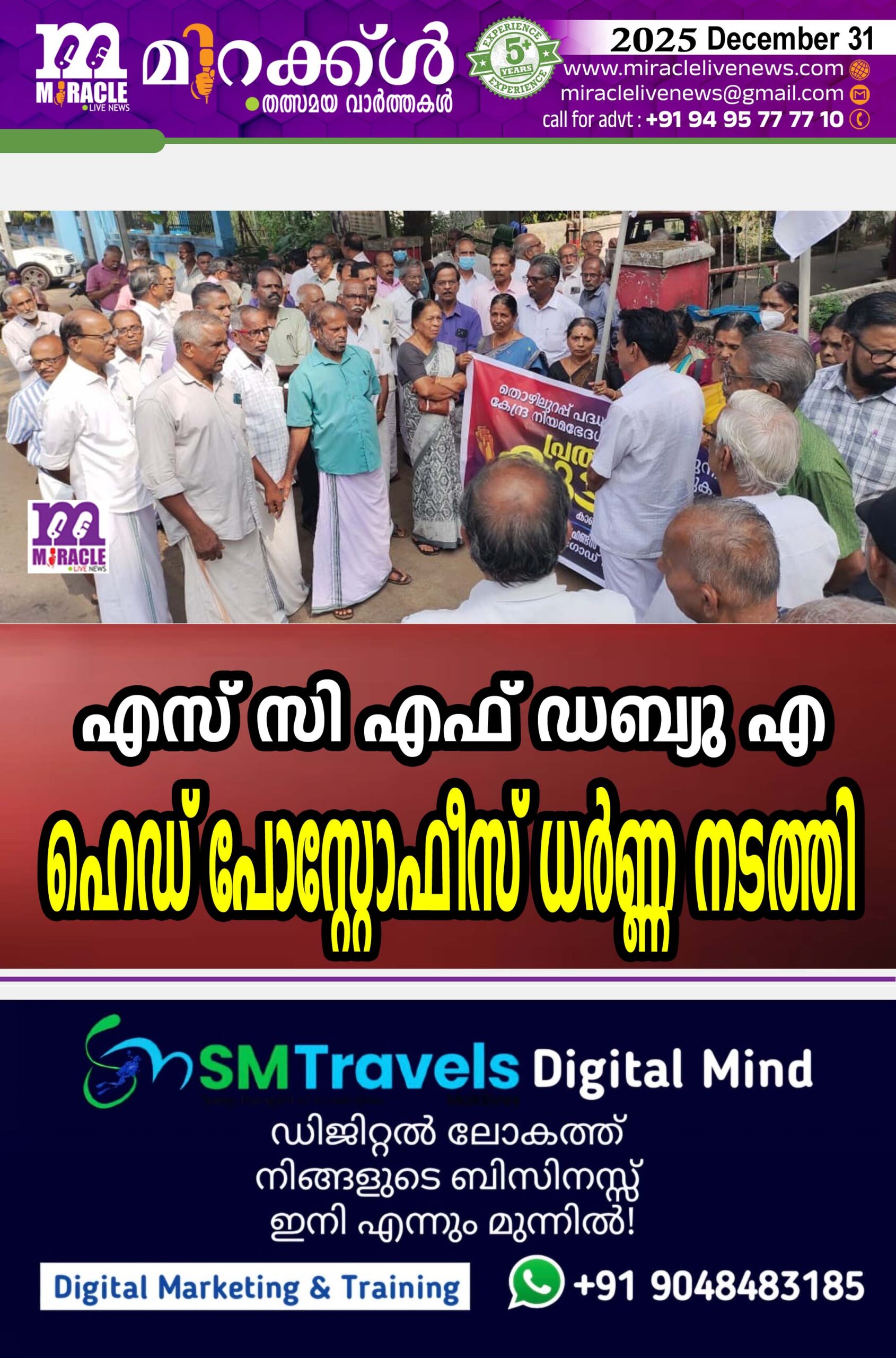 കാഞ്ഞങ്ങാട് : മഹാത്മാഗാന്ധിയുടെ പേരില് തന്നെ തൊഴില് ഉറപ്പ് പദ്ധതി നിലനിര്ത്തുക, നിയമ ഭേദഗതി പിന്വലിക്കുക, കേന്ദ്ര ഗവ. നീതി പാലിക്കുക എന്നീ ആവശ്യങ്ങളുയര്ത്തി സീനിയര് സിറ്റിസണ് ഫ്രണ്ട്സ് വെല്ഫേര് അസോസിയേഷന് ജില്ലാ കമ്മിറ്റിയുടെ നേതൃത്വത്തില് വയോജനങ്ങള് കാഞ്ഞങ്ങാട് ഹെഡ് പോസ്റ്റോഫീസിനു മുമ്പില് ധര്ണ്ണ നടത്തി. ടി.ഗംഗാധരന് ഉദ്ഘാടനം ചെയ്തു സംസ്ഥാന കമ്മിറ്റി അംഗം കൂത്തൂര്കണ്ണന്, രാജന് മടത്തനാടന് ,സി വിജയന് കാഞ്ഞങ്ങാട് മേഖലാ സെക്രട്ടറി പി കെ പ്രകാശന് എന്നിവര് പ്രസംഗിച്ചു. ജില്ലാ സെക്രട്ടറി എന്. കുഞ്ഞികൃഷ്ണന് സ്വാഗതം പറഞ്ഞു.