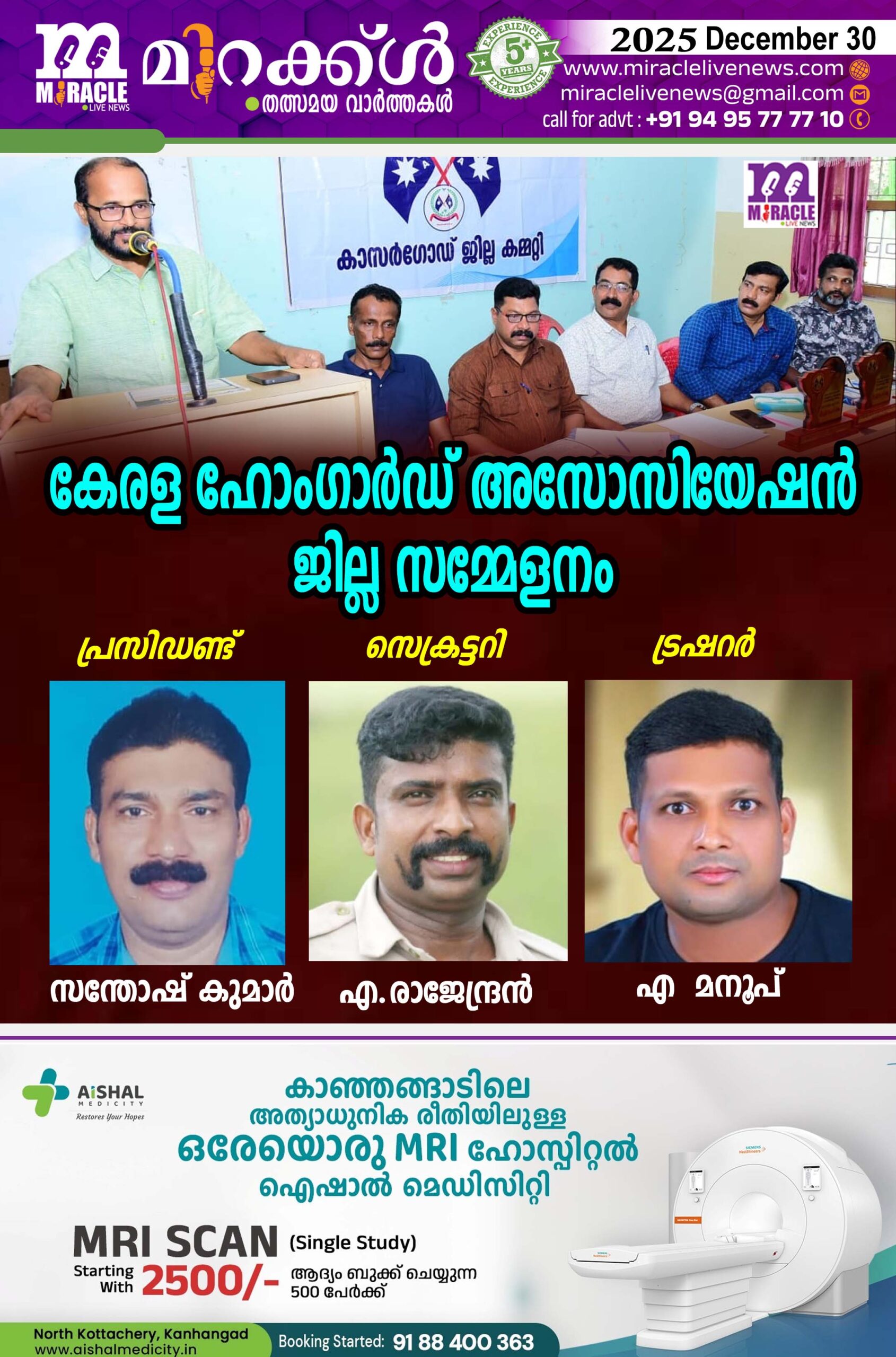 ഹോംഗാര്ഡുമാര്ക്ക് പ്രൊവിഡണ്ട് ഫണ്ട് ഏര്പ്പെടുത്തണമെന്ന് അസോസിയേഷന് ആവശ്യപ്പെട്ടു. സമ്മേളനത്തില് വെച്ച് 2026 – 27 വര്ഷത്തേക്കുള്ള പുതിയ ഭാരവാഹികളെ തെരഞ്ഞെടുത്തു. കെ കെ സന്തോഷ് കുമാര് (പ്രസിഡന്റ്), ഗോപിനാഥന് നായര്, എന് പി രാജന് (വൈസ് പ്രസിഡന്റുമാര്), എ.രാജേന്ദ്രന് (സെക്രട്ടറി) , സജിന് പലേരി, വി രാജു (ജോ: സെക്രട്ടറിമാര്) , എ മനൂപ് (ട്രഷറര്)