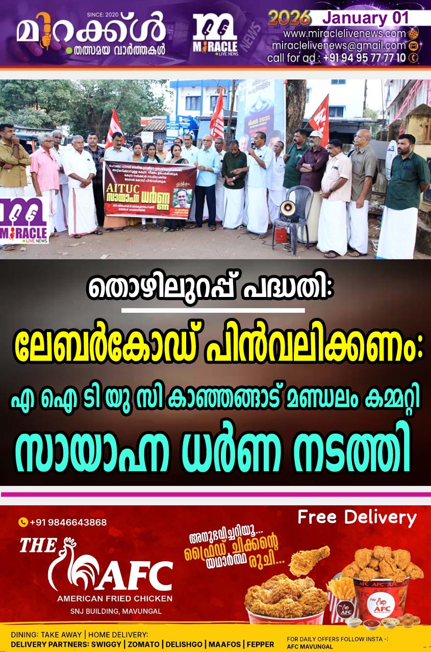 കാഞ്ഞങ്ങാട്: മഹാത്മാ ഗാന്ധി ദേശീയ ഗ്രാമീണ തൊഴിലുറപ്പ് പദ്ധതി ആറ്റിമാര്കാനുള്ള നരേന്ദ്രമോഡി സര്ക്കാരിന്റെ നീക്കത്തിനെതിരെയും. ലേബര്കോഡ് പിന്വലിക്കണം എന്നവാശ്യപെടുകൊണ്ടും എ ഐ ടി യു സി മണ്ഡലം കമ്മറ്റിയുടെ നേതൃത്വത്തില് മന്തോപ്പ് മൈതാനിയില് സായാഹ്ന ധര്ണ നടത്തി. സമരം സംസ്ഥാന സെക്രട്ടറി അഡ്വ . ഗോവിന്ദന് പള്ളികപ്പില് ഉദ്ഘാടനം ചെയ്തു. കെ. ശാരങ്ങധരന് അധ്യക്ഷത വഹിച്ചു. പി. ബാലകൃഷ്ണന്,സി കെ. ബാബുരാജ്, പി. മിനി, ഗംഗാധരന് പള്ളികപ്പില്, കെ. ചന്ദ്രശേഖരന്, ബ്ലോക്ക് പഞ്ചായത്ത് വൈസ്പ്രസിഡന്റ് പി. ഗോവിന്ദന്. കാഞ്ഞങ്ങാട് മുന്സിപ്പാള് കൗണ്സിലര് പി. എം. മിനിമോള് എന്നിവര് സംസാരിച്ചു. എ ദാമോദരന് സ്വാഗതം പറഞ്ഞു.