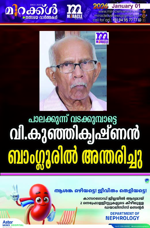 കരിവെള്ളൂര്: പാലക്കുന്ന് വടക്കുമ്പാട്ടെ വി.കുഞ്ഞികൃഷ്ണന് (79) ബാംഗ്ലൂരില് അന്തരിച്ചു. ഭാര്യ: വി.വി.ശാന്ത. മക്കള്: സന്തോഷ് (മസ്ക്കറ്റ് ), സജിത (ബാഗ്ലൂര്). മരുമക്കള്: കാവ്യ (മസ്ക്കറ്റ് ),ഷിബു.(ബാംഗ്ലൂര്). സഹോദരങ്ങള്: ജാനകി (ആലക്കാട്) പരേതരായ കുഞ്ഞിരാമന്,
