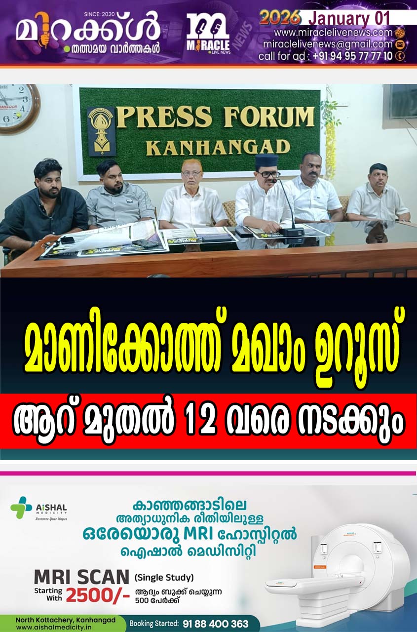കാഞ്ഞങ്ങാട്:ഖാസി ഹസൈനാര് പേരില് നടക്കുന്ന മാണി ക്കോത്ത് മഖാം ഉറൂസ് ജനുവരി ആറു മുതല് പന്ത്രണ്ട് വരെ വിവിധ പരിപാടികളിലായി നടക്കുമെന്ന് ജമാഅത്ത്, ഉറൂസ് കമ്മിറ്റി ഭാരവാഹികള് വാര്ത്ത സ മ്മേളനത്തില് അറിയിച്ചു. നാളെ ഉച്ചക്ക് മാണി ക്കോത്ത് ജുമ മസ്ജിദ് ഖത്തീബ് മുഹുയുദ്ധീന് അല് അസ്ഹരിയുടെ നേതൃത്വത്തില് മഖാം സിയാറത്തും ഉറൂസ് കമ്മിറ്റി ചെയര്മാന് വി.വി അബ്ദുറഹ്മാന് ഹാജി പതാക ഉയര്ത്തുന്നതോടെ കൂടി പരിപാടികള്ക്ക് തുടക്കമാവും.തുടര്ന്ന് മഖാം ഉറൂസ് ഉദ്ഘാടനം ജനുവരി ആറിന് വൈകീട്ട് ഏഴ് മണിക്ക് ജമാഅത്ത് പ്രസിഡന്റ് മുബാറക് ഹസൈനാര് ഹാജിയുടെ അധ്യക്ഷതയില് സയ്യിദ് സൈനുല് ആബിദീന് തങ്ങള് അല് ബുഖാരി ഉദ്ഘാടനം ചെയ്യും. തുടര്ന്ന് ഹുബ്ബുല് ഹബീബ് മദ്ഹ് സംഘം അവതരിപ്പിക്കുന്ന മദ്ഹെ മദീന മജ്ലിസ് നടക്കും. ഹാഫിള് നൗഫല് അല് ഫാളിലി ടീം നേതൃത്വം നല്കും. ഏഴിന് രാത്രി ഏഴ് മണിക്ക് മാഷപ്പ് അവതരിപ്പിക്കും. രാത്രി ഒമ്പത് മണിക്ക് ഡോ.ഹാഫിള് ജു നൈദ് അല് അസ്ഹരി കൊല്ലം മത പ്രഭാഷണം നടക്കും. ജനുവരി എട്ടിന് രാത്രി എട്ട് മണിക്ക് മജ്ലിസുന്നൂര് നടക്കും. തുടര്ന്ന് രാത്രി ഒമ്പത് മണിക്ക് മഹമൂന് ഹുദവി വണ്ടൂര് മത പ്രഭാഷണം നടക്കും. ജനവരി ഒമ്പത് വെള്ളി വൈകീട്ട് നാലു മണിക്ക് സൗഹൃദ സദസ് നടത്തും. സ്വാമി ഗുരു രത്നം ജ്ഞാനതപസ്വി പ്രഭാഷണം നടത്തും. രാത്രി ഏഴ് മണിക്ക് മെഗാ ദഫ് മല്സരം നടക്കും. രാത്രി ഒമ്പത് മണിക്ക് അബ്ദുറസാഖ് അബ്റാറി പത്തനംത്തിട്ട മതപ്രഭാഷണം നടക്കും. ജനുവരി പത്തിന് ശനി രാത്രി എട്ട് മണിക്ക് ശുക്കൂര് ഇര്ഫാനി റഹൂഫ് അസ്ഹരി നയിക്കുന്ന ഇശല് വിരുന്ന് നടക്കും. രാത്രി ഒമ്പത് മണിക്ക് സിറുജുദ്ധീന് അല് ഖാസിമി പത്തനാപുരത്തി ന്റെ മത പ്രഭാഷണം നടക്കും. ജനുവരി 11ന് സമാപന സ മ്മേളനം കാഞ്ഞങ്ങാട് സംയുക്ത ജമാഅത്ത് പ്രസിഡന്റ് സയ്യിദ് ജിഫ്രി മുത്തു കോയ തങ്ങള് ഉദ്ഘാടനം ചെയ്യും. മുസ്തഫല് സഖാഫി തെന്നല മത പ്രഭാഷണം നടത്തും. സയ്യിദ് മഹ്റൂഫ് മദനി അല് ജിഫ്രി കല്ലടി ക്കോട് തങ്ങള് കൂട്ടു പ്രാര്ഥന നടത്തും. ജനുവരി 12ന് തിങ്കള് ഉച്ചക്ക് മൗലീദ് പാരായണം നടക്കും. വൈകീട്ട് അന്നദാനവും നടക്കും. വാര്ത്ത സ മ്മേളനത്തില് ഉറൂസ് കമ്മിറ്റി ചെയര്മാന് വി.വി അബ്ദുറഹ്മാന് ഹാജി, വൈസ് ചെയര്മാന് മുല്ല ക്കോയ തങ്ങള് മാണി ക്കോത്ത്, ട്രഷറര് പി അഷ്റഫ്, കണ്വീനര് നദീര്ഷ മല്ലമ്പലം, കണ്വീനര് യൂനസ് ബദര് നഗര്, വൈസ് ചെയര്മാന് ലീഗ് മജീദ്, കരീം മൈത്രി എന്നിവര് സംബന്ധിച്ചു.