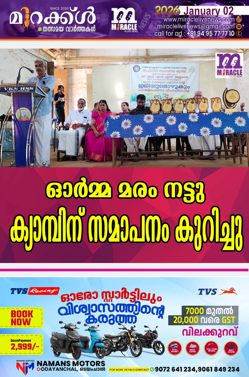 ബളാല് ഗവണ്മെന്റ് ഹയര്സെക്കന്ഡറി സ്കൂള് എന്എസ്എസ് യൂണിറ്റിന്റെ സപ്തദിന സഹവാസ ക്യാമ്പ് ‘ഇനിയും ഒഴുകും മാനവ സ്നേഹത്തിന് ജീവവാഹിനിയായി ‘ ന്റെ സമാപനത്തില് ഓര്മ്മ മരം നട്ട് സമാപനമായി. വരക്കാട് വള്ളിയോടന് കേളുനായര് സ്മാരക ഹയര് സെക്കന്ററി സ്കൂളില് ഡിസംബര് 26 ന് ജില്ലാ പഞ്ചായത്ത് മെമ്പര് ഒക്ലാവ് കൃഷ്ണന് ഉദ്ഘാടനം ചെയ്ത ബളാല് സ്കൂള് എന് എസ് എസ് യൂണിറ്റിന്റെ സപ്തദിന സഹവാസക്യാമ്പ് ജനുവരി ഒന്നിന് ഉച്ചയോടെ സമാപിച്ചു. ബളാല് സ്കൂള് പി.ടി.എ പ്രസിഡന്റ് സുരേഷ് മുണ്ടമാണിയുടെ അധ്യക്ഷതയില് ബ്ലോക്ക് പഞ്ചായത്ത് മെമ്പര് ഇ .ടി . ജോസ് സമാപന സമ്മേളനം ഉദ്ഘാടനം ചെയ്തു. എന് എസ് എസ് വളണ്ടിയര്മാര് തയ്യാറാക്കിയ വരക്കാടിന്റെ പ്രദേശിക ചരിത്രം ‘ ദേശ നാഴിക ‘ വിശിഷ്ടാതിഥിയായ വെസ്റ്റ് എളേരി പതിമൂന്നാം വാര്ഡ് മെമ്പര് കെ.ജനാര്ദ്ദനന് പ്രകാശനം ചെയ്തു. വളണ്ടിയര്മാര്ക്ക് ‘ അവാര്ഡ് വിതരണം ഉദ്ഘാടനകനും വിശിഷ്ടാതിഥിയും കൂടി നിര്വ്വഹിച്ചു. ആശംസകള് അര്പ്പിച്ച് വരക്കാട് സ്കൂള് പി.ടി.എ വൈസ് പ്രസിഡന്റ് പ്രഭാകരന്, വരക്കാട് സ്കൂള് ഹെഡ്മിസ്ട്രസ് നിഷ പി.കെ, സീനിയര് അസിസ്റ്റന്റ് കലാവതി പി.വി, ബളാല് ഹയര് സെക്കന്ററി സ്കൂള് സ്റ്റാഫ് സെക്രട്ടറി മോളി കെ.ടി, ഹൈസ്കൂള് സ്റ്റാഫ് സെക്രട്ടറി മോഹന് ബാനം എന്നിവര് സംസാരിച്ചു. വളണ്ടിയര്മാരായ ഋഷികേശ്, അനഘ എം.എ, നിവേദ്യ , സത്യ എസ് ബോസ് എന്നിവര് ക്യാമ്പ് റിവ്യു നടത്തി. യോഗത്തില് സീനിയര് അസിസ്റ്റന്റ് മൈസണ് കെ സ്വാഗതവും, പ്രോഗ്രാം ഓഫീസര് പ്രിന്സി സെബാസ്റ്റ്യന് നന്ദിയും പറഞ്ഞു. ദേശീയഗാനത്തോടെ ഒരാഴ്ച നീണ്ടുനിന്ന നാടറിഞ്ഞ സഹവാസ ക്യാമ്പിന് സമാപനം കുറിച്ചു.